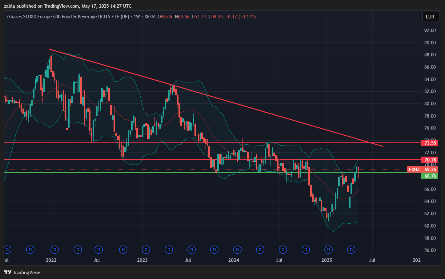 A StockInvest.us elemzése szerint a rövid távú trend szerint az ETF ára -5,02%-os esésre számítható a következő 3 hónapban, de ha az árfolyam a jelenlegi szinten marad, ez a cél módosulhat. Igen ezt jól mutatja, hogy a heti grafikonon jól láthatod, hogy a kalapács ott van a grafikonon. Ami némi emelkedés után, csökkenést hozz maga után. Tehát a 70 €-os ellenállás igen erős leht az árfolyamnak.