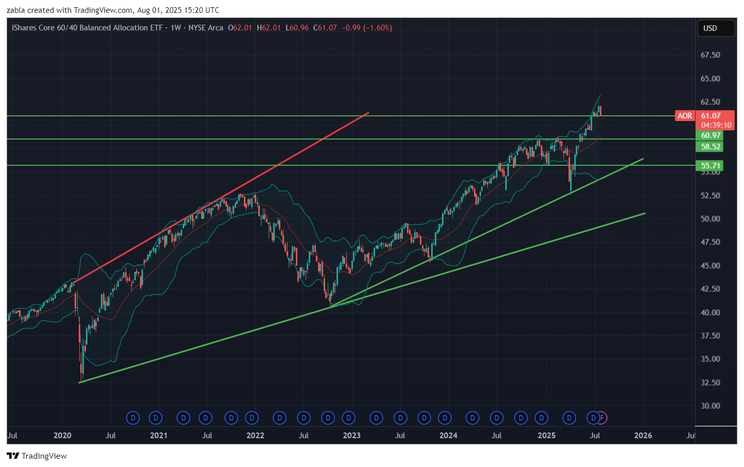 Összegzésül: Az AOR ETF alapstratégiája a klasszikus 60/40 részvény-kötvény elosztásra épül, alacsony díjakkal (0.15%/év), globális diverzifikációval, mérsékelt volatilitással és negyedéves osztalékfizetéssel. Ez az ETF hosszú távra, kiegyensúlyozott növekedés kereső befektetők számára ideális, akik nem akarnak aktívan részvényeket szelektálni, de értékelik a kiszámítható jövedelmet és a kockázatok mérséklését is. Technikailag igen túlvettnek számíthat az ETF alap. De a heti grafikon jól mutatja, hogy a vízszintes vonalak lehetnek a fontosabb szintek. Forrás: több pénzügyi oldal