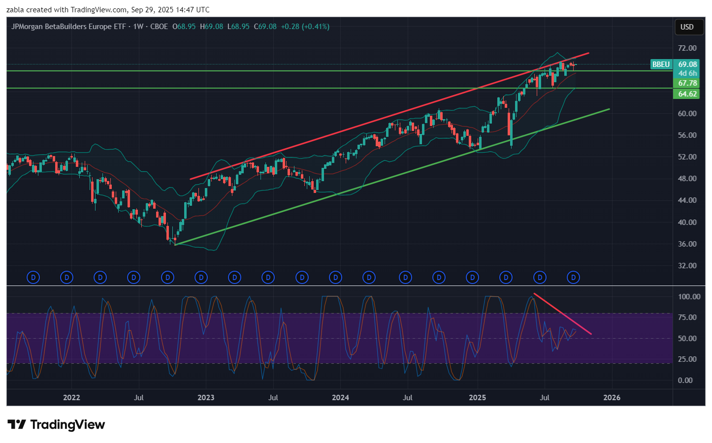 BBEU Fejlett Európa lassuló emelkedés. A JPMorgan BetaBuilders Europe ETF (BBEU) az egyik legnagyobb, fejlett európai részvényeket követő passzív ETF, amely a Morningstar Developed Europe Target Market Exposure Index teljesítményét igyekszik leképezni. A BBEU ETF alap nagy és közepes kapitalizáció európai vállalatok tartalmazzák több ország részvénypiaciról, portfóliójában jelenleg közel 407 különböző részvény található. A BBEU árfolyamának technikai szempontból jelenleg egy szűk, enyhén emelkedő trendben mozog, rövid távon további 5%-os árfolyamemelkedési potenciált jeleznek az előrejelzések. Az ETF főbb technikai indikátorai – például a 3 hónapos MA, valamint a rövid és hosszú távú mozgóátlagok – egyaránt vételi jelzést adnak, ami pozitív hangulatot tükröz. Az aktuális kulcstámasz szint 67,87 USD, míg a főbb ellenállások 70-72 USD között húzódnak.