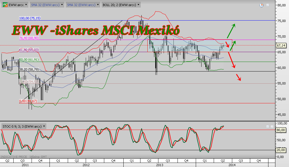 Az America Movil vállalaton kívül tehát a többi 4 jelentősebb vállalat a következő: Fomento 7,54%, GPO Finance 7,29%, Grupo Televisa 6,82% és a Cemex 5,84%. Azt is érdemes megemlíteni, hogy csupán 95%-ban mexikói az ETF alap, mivel a maradék közel 5%-os résszel perui részvények osztozkodnak. Így alakul ki, hogy a bizonytalan mucsácsó inkább lefele kacsingat. Felfele a 68,9 $-os szint lehet döntő, lefele pedig a 65 $-os támasz határozhatja meg a jövőbeni árfolyam sorsát.