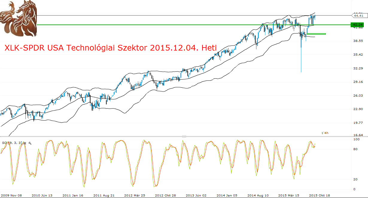 Brutálisan Erősek az amerikai technológiai szektorba tartozó részvények. Ezt nagyon jól mutatja a heti XLK-SPDR USA S&P technológiai szektor ETF alap árfolyamának alakulása. De azt is le kell írni, hogy sérülékeny is, ezt jól mutatja a csökkenő gyertya mélysége is. Na de egyenlőre úgy fest a dolog, hogy igen erősen ostromolja az újabb csúcsokat a XLK árfolyama.