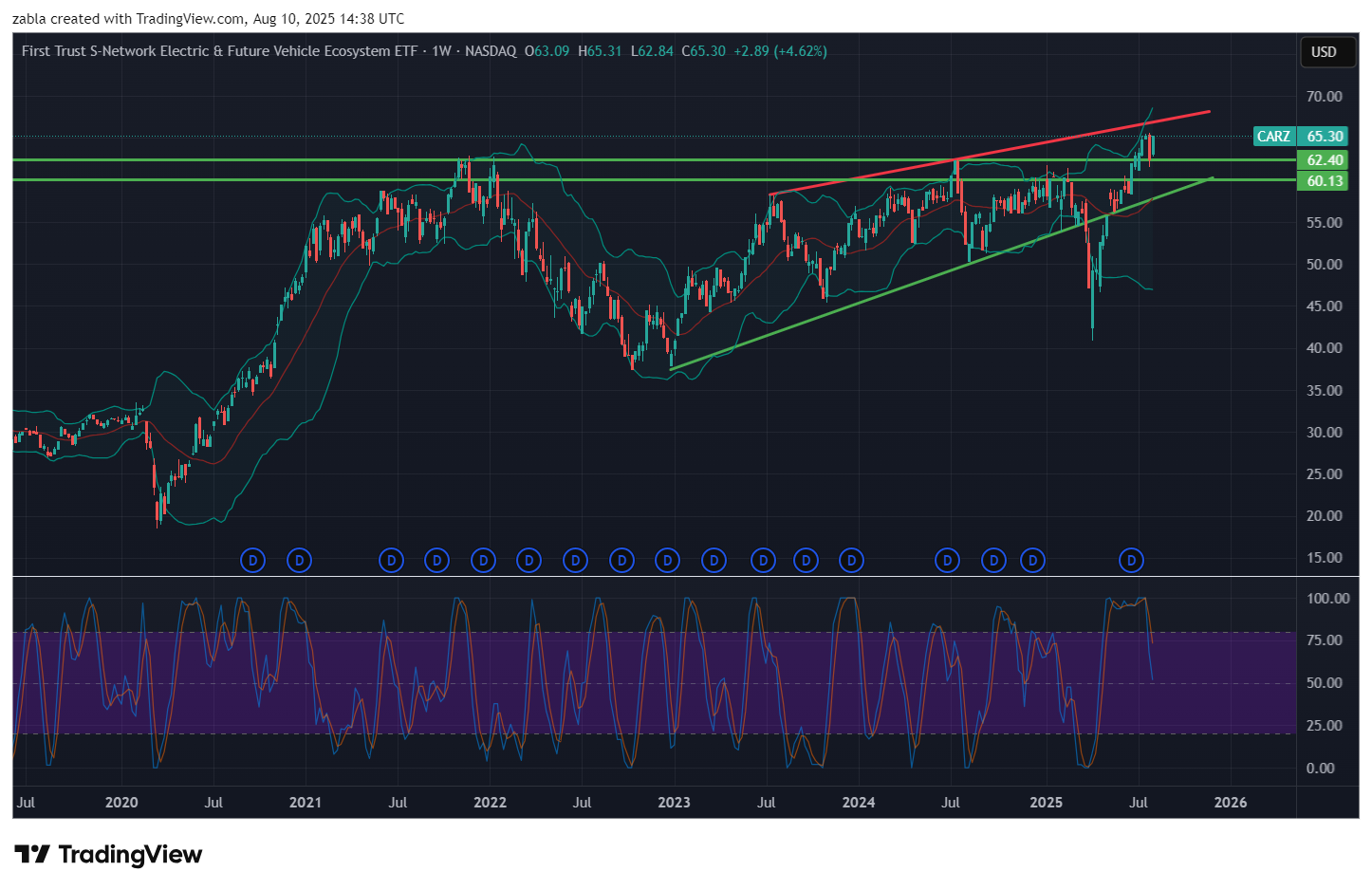 CARZ ETF teljesítménye félvezetői szektortól hangos. A CARZ az S-Network Electric & Future Vehicle Ecosystem indexet követi, és főként EV/AV ökoszisztémához kapcsolódó technológiai és autóipari részvényekbe fektet, a top 10 súlya 46%.