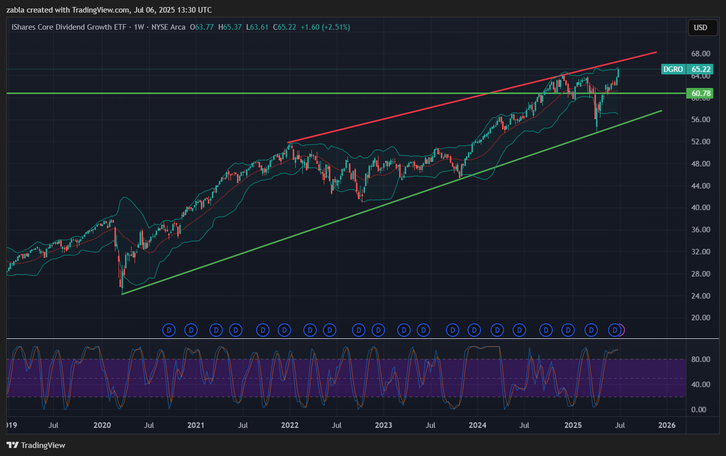 Összességében a DGRO 2025-ben is megbízható osztalékfizető, árfolyama stabil, és technikailag további mérsékelt emelkedés várható, ha a makrogazdasági környezet nem romlik jelentősen. A heti grafikon is remekül mutatja, hogy igen népszerű az ETF, a ferde piros ellenállási szint lehet érdekes. Lefordulás esetén avízszintes zöld támasz 60 $-nál lehet érdekes. forrás: több pénzügyi oldal