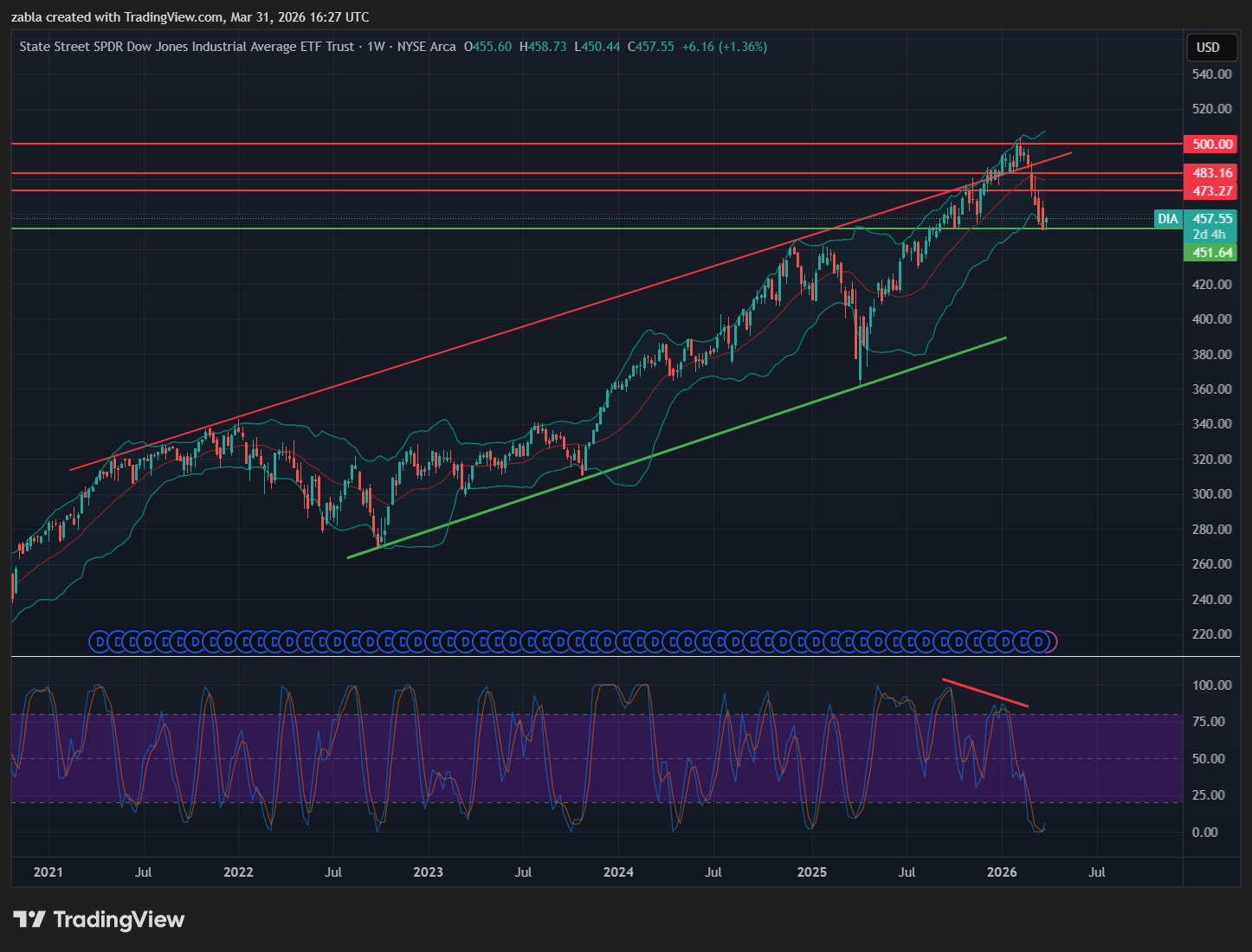 Figyelemmel kíséred a Dow Jones és a DIA ETF alakulását, és azt látod, hogy a március 31-i állapot egyfajta átmeneti megkönnyebbülést hozott számodra a 10%-os korrekció után.
