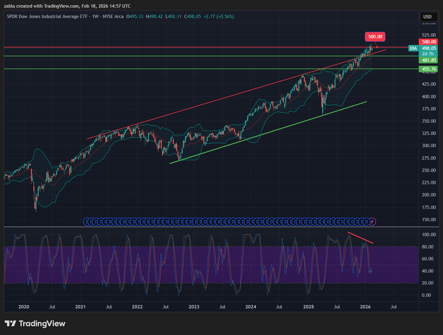 A DIA ETF 2026-ban nem csupán egy befektetési eszköz, hanem az amerikai gazdaság rugalmasságának tesztje is egy olyan korszakban, ahol az infláció, a munkaerőpiaci bizonytalanság és a geopolitikai feszültségek egyaránt jelen vannak. A következő hetek heti szintű adatai és technikai záróárai fogják megadni a választ arra, hogy a 500 pontos Dow Jones indexszint egy tartós bázis vagy csupán egy átmeneti csúcs volt-e a 2026-os tőzsdei ciklusban. A heti DIA grafikon és indikátora, némi divergenciát mutat, ami annyit tesz, hogy némi korrekció is érkezhet az index árfolyamába. De egyenlőre a heti grafikon és a feljebb említett információk további vételeket mutatnak. Forrás: több pénzügyi oldal