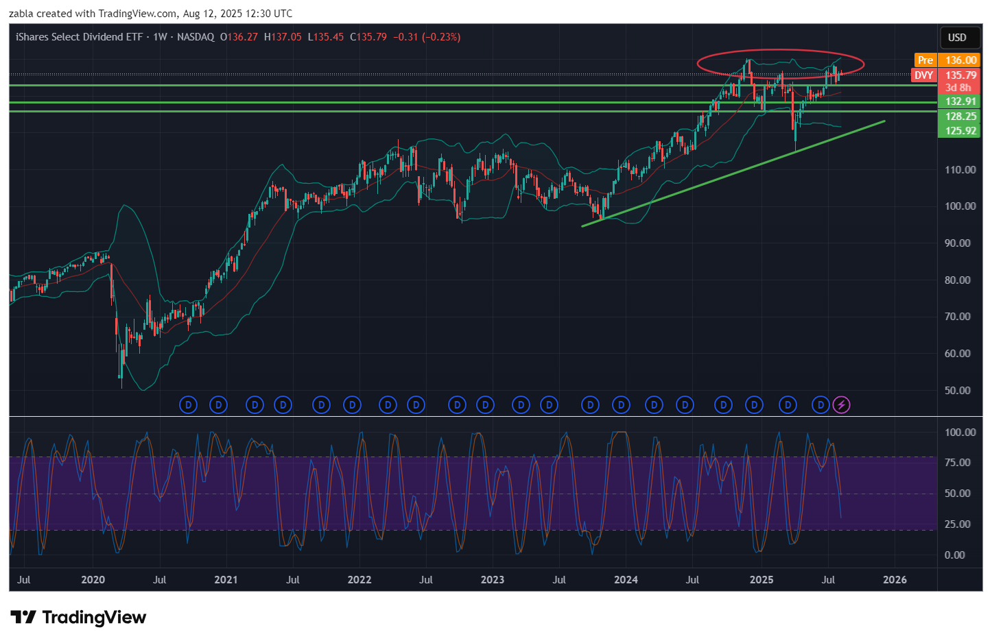 Összességében a DVY azoknak lehet hasznos, akik kiegyensúlyozott, negyedéves készpénzáramot keresnek, és elfogadják, hogy az árfolyam a kamat- és szektorhírekre érzékenyebb lesz, mint egy „mindentvivő” indexkövetőnél. Egyenlőre a heti grafikonon mutatkozik egy dupla csúcs, ami korrekciót is hozhat az árfolyamba! Egy remek végszó: „DVY – osztalék, ami nem kávézáskor csöpög, hanem negyedévente csattan!” forrás: több pénzügyi oldal
