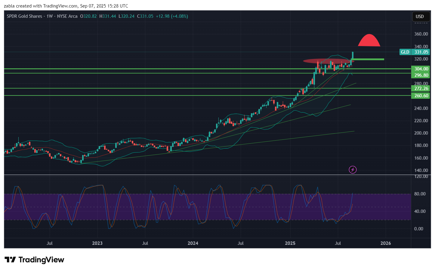 Az elkövetkező két hónap kulcsfontosságú lesz: ha a Fed valóban kamatvágásba kezd és a geopolitikai feszültségek fennmaradnak, a GLD tovább emelkedhet a 350-360 dollár környékéig, ami további 5-8%-os potenciális emelkedést vetít előre. A heti GLD ETF alap nagyon berobbant, mely rést hagyott maga alatt, cirka 320 $ környékén, erre érdemes figyelned. De egyenlőre az RSI indikátor is támogatja a további emelkedést. forrás: több pénzügyi oldal
