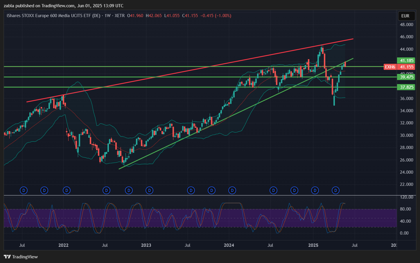 Európai Médiás EXH6 ETF némi korrekciót mutat. Az iShares STOXX Europe 600 Media UCITS ETF (EXH6) a vezető európai médiavállalatokat követi, portfóliójának több mint 80%-át az öt legnagyobb szereplő – például Wolters Kluwer, Publicis Groupe és Universal Music Group – teszi ki.