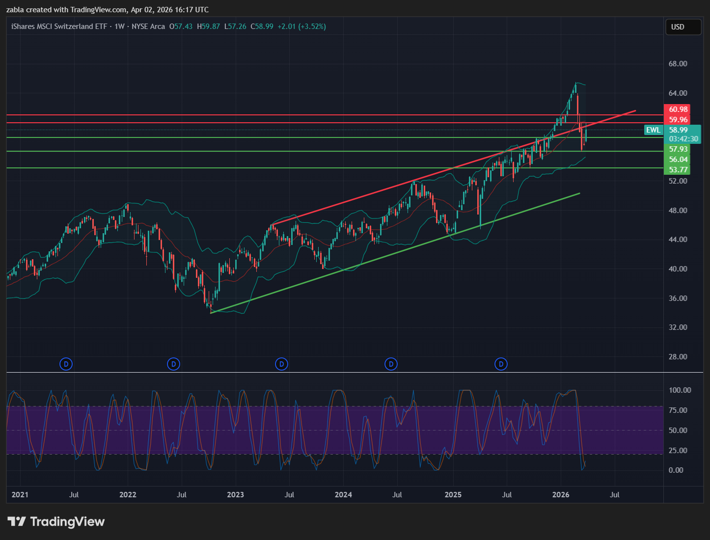 Összességében egy óvatosan optimista, de a geopolitikai hírekre rendkívül érzékeny piaci környezetben kell navigálnod az elkövetkező hetekben. A heti EWL grafikon szépen megindult felfelé, de egyenlőre a 60 USD-s ellenállás kicsit vissza pofozta az árfolyamot. De biztató jelzést mutat a heti RSI indikátor, mert szép lassan vételi jelzésekbe fordul. Így érdekes és remek ETF alappal találkoztál. Forrás: több pénzügyi oldal