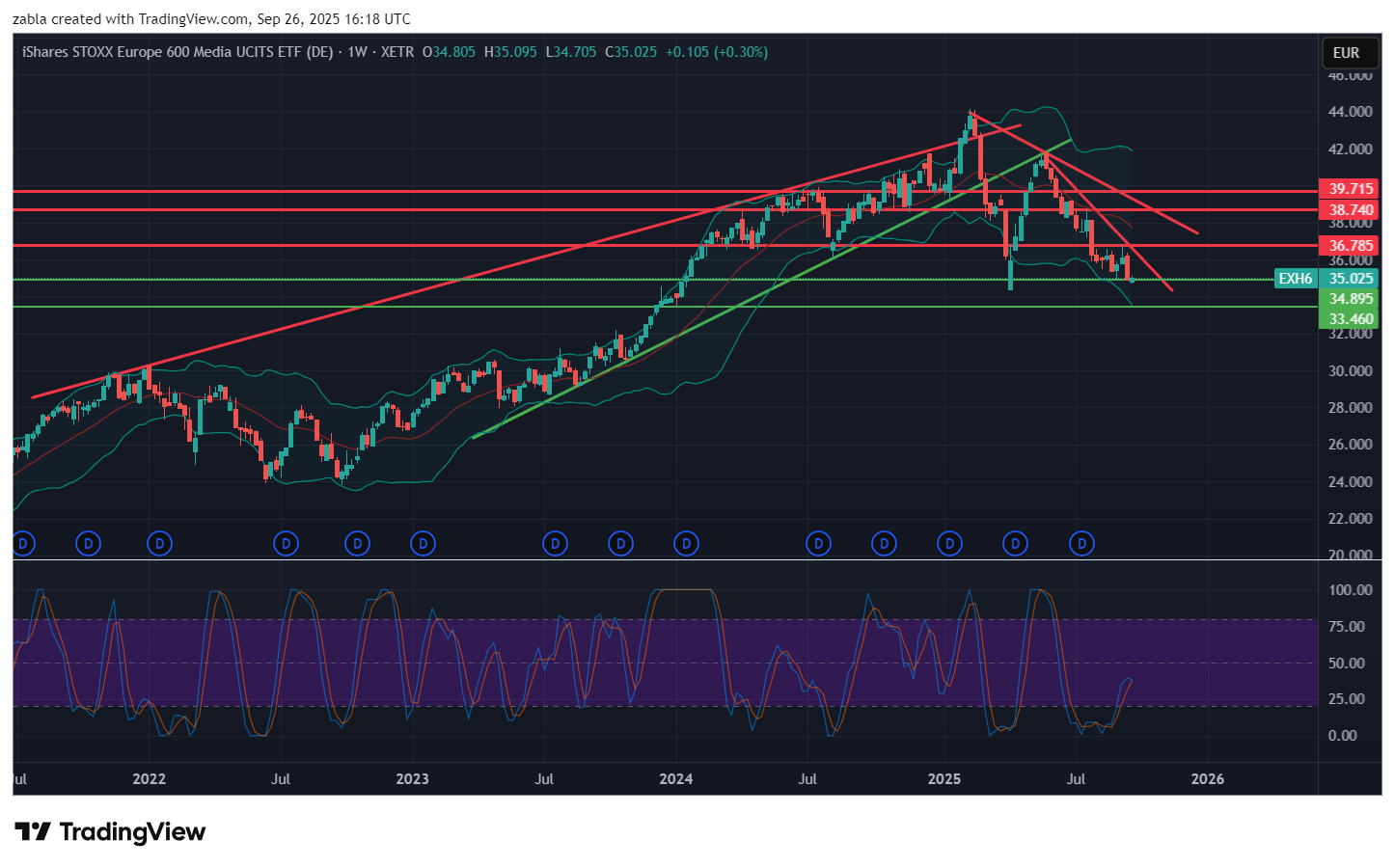 EXH6 Európai Médiás ETF igen gyenge szinteken. Az iShares STOXX Europe 600 Media UCITS ETF (EXH6) az európai média szektorban működő vállalatokat követi, és 0,46%-os költséghányaddal rendelkezik. Az alap 11 millió eurós vagyonnal bír, fizet osztalékot, és 2002 óta működik. Mostanság összesen 8 cég átlagát méri.