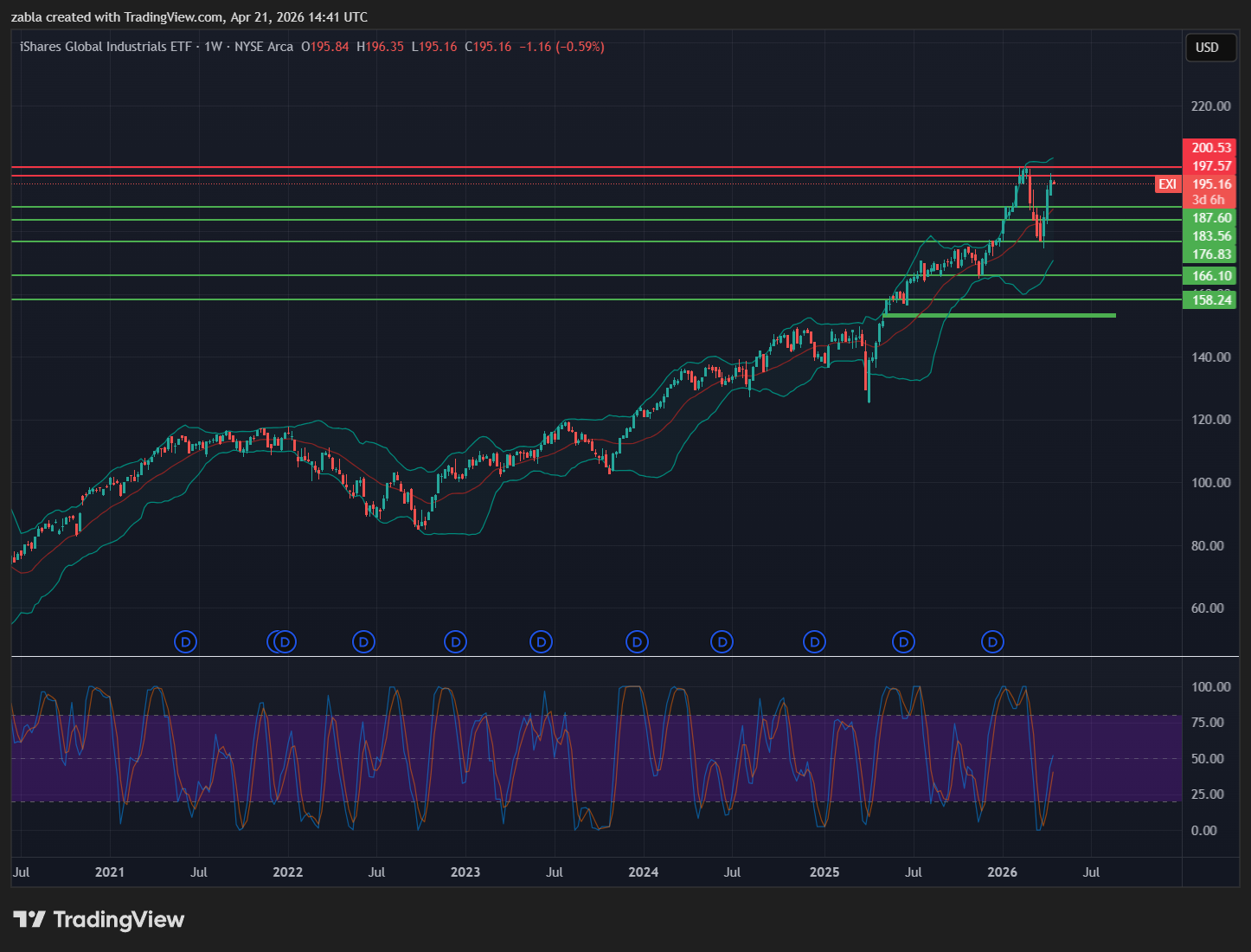 EXI Globális ipar emelkedése némileg megtorpant. Az EXI‑iShares Global Industrials ETF árfolyama 2026.04.21-én éves 195,87 USD körül mozog, ami az intervallumon belül, a 141,11–200,43 USD közötti tartományban a felső harmadhoz közeli, de még nem új csúcs.