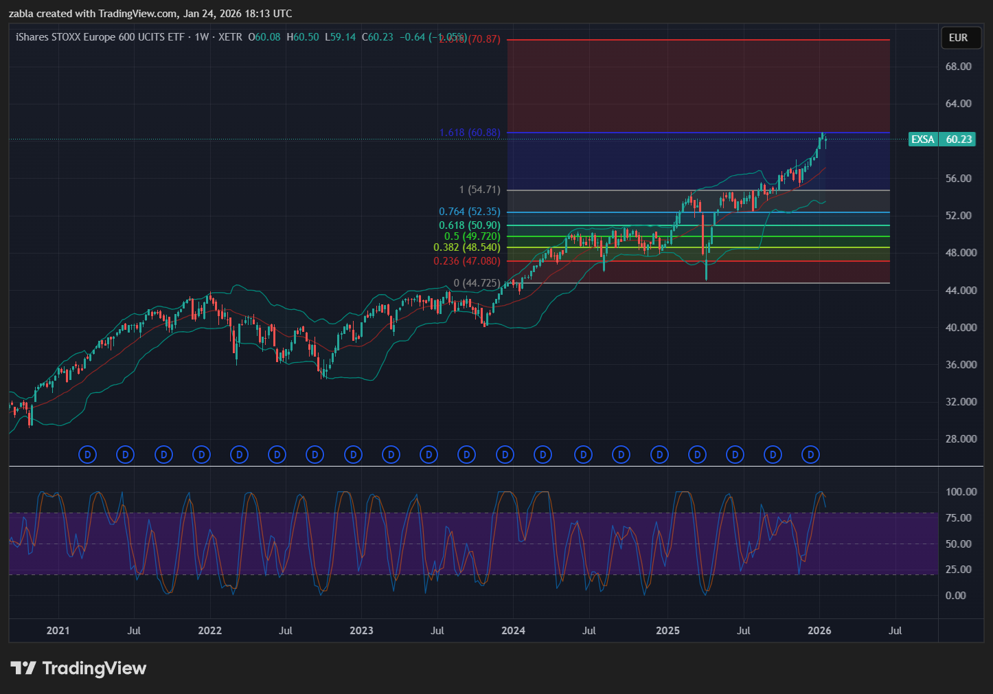 Összességében: A heti RSI indikátor erőteljes eladási jeleket kezd mutatni, amit a heti EXSA ETF grafikon is jól mutat. Mivel a 60-61 €-os ellenállás már túl erősnek bizonyult. Egyenlőre azt lehet kiolvasni, hogy a folyamatos európai top cégek gyorsjelentései mozgathatják meg az ETF alap árfolyamának alkulását. Forrás: több pénzügyi oldal