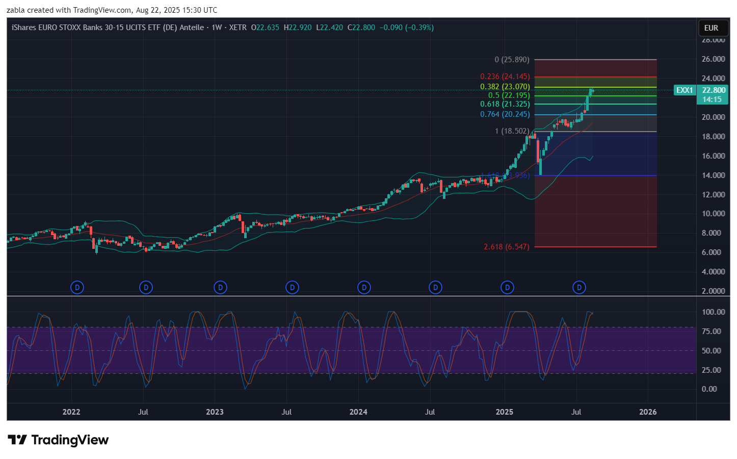 Az ETF technikailag egy erős emelkedő trendet mutatott 2024-től kezdve, és jelenleg is pozitív momentum tapasztalható – bár rövid távú korrekciók nem zárják ki. Legfontosabb bankok az indexben: Banco Santander (12,69 %), UniCredit (10,65 %), BNP Paribas (9,09 %), és több jelentős európai pénzintézet.