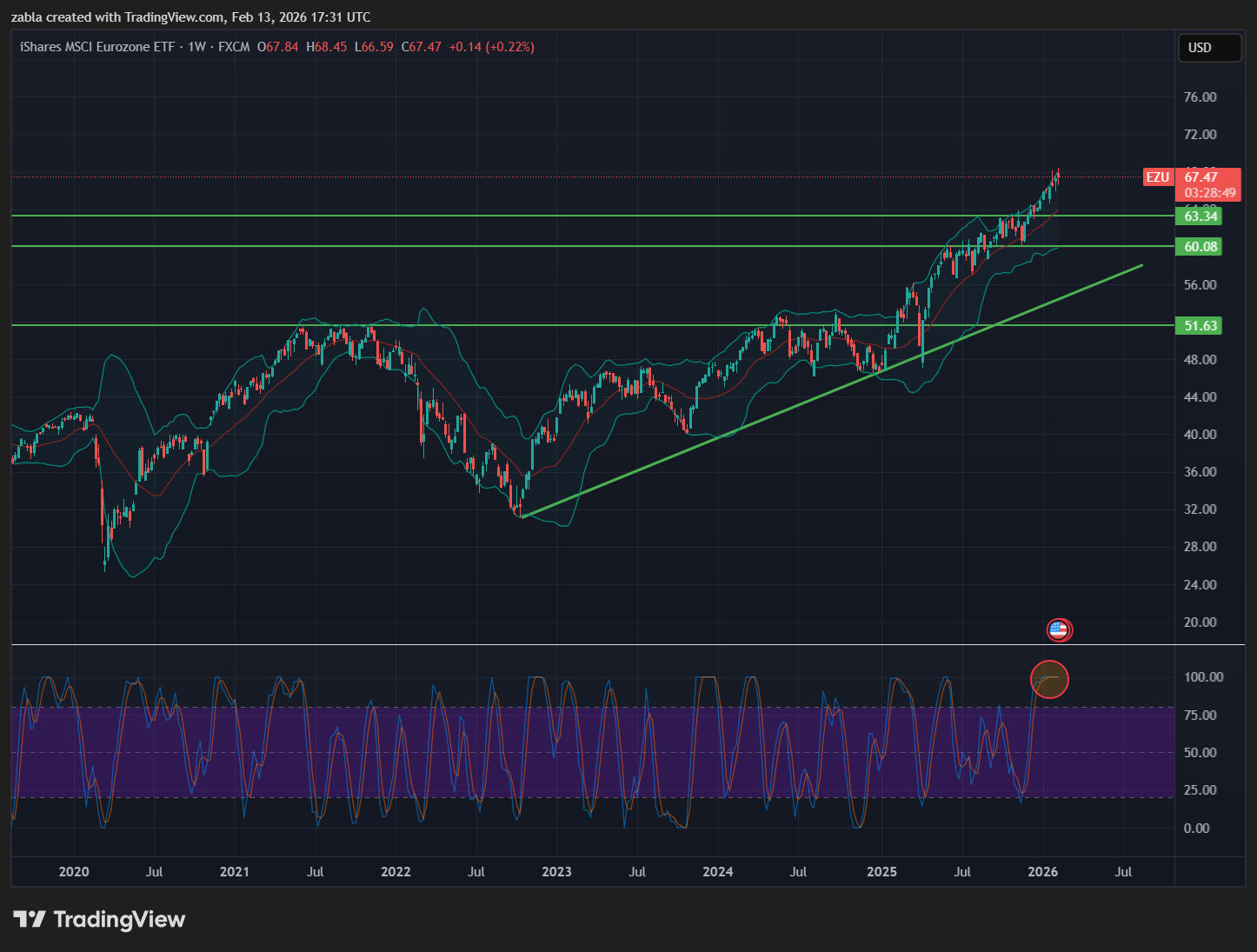 Az iShares MSCI Eurozone ETF (EZU) február második felében továbbra is mérsékelt emelkedő pályán maradhat, amennyiben az EKB türelmes monetáris politikája és a stabilizálódó inflációs adatok nem okoznak negatív meglepetést. A heti szintű árfolyammozgást elsősorban a február 20-i BMI és bérnövekedési statisztikák, valamint a február 25-i végleges inflációs adatok fogják meghatározni. Az árfolyamot befolyásoló tényezők közül kiemelkednek a transzatlanti kereskedelmi feszültségek, különösen az amerikai importvámok körüli bizonytalanság és a kínai kereslet alakulása. A heti EZU grafikon legnagyobb figyelme az, hogy igen erőteljesen túl van húzva. Amit a heti RSI indikátor is megerősít, így nagyon nagy a valószínűsége annak, hogy az eurózóna indexe némi korrekciót indíthat el. Tehát egyenlőre némileg érdemes zárni a pozikat, és figyelni a geopolitikai fejleményeket az EU mellet. forrás: több pénzügyi oldal