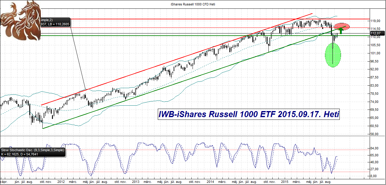Felfele Mutat Amerika 1000 legmeghatározóbb cégeinek az indexe. Az IWB-iShares Russell 1000 ETF alap, igen szépen mutatja heti szinten, hogy még van az amerikai piacban emelkedési potenciál.