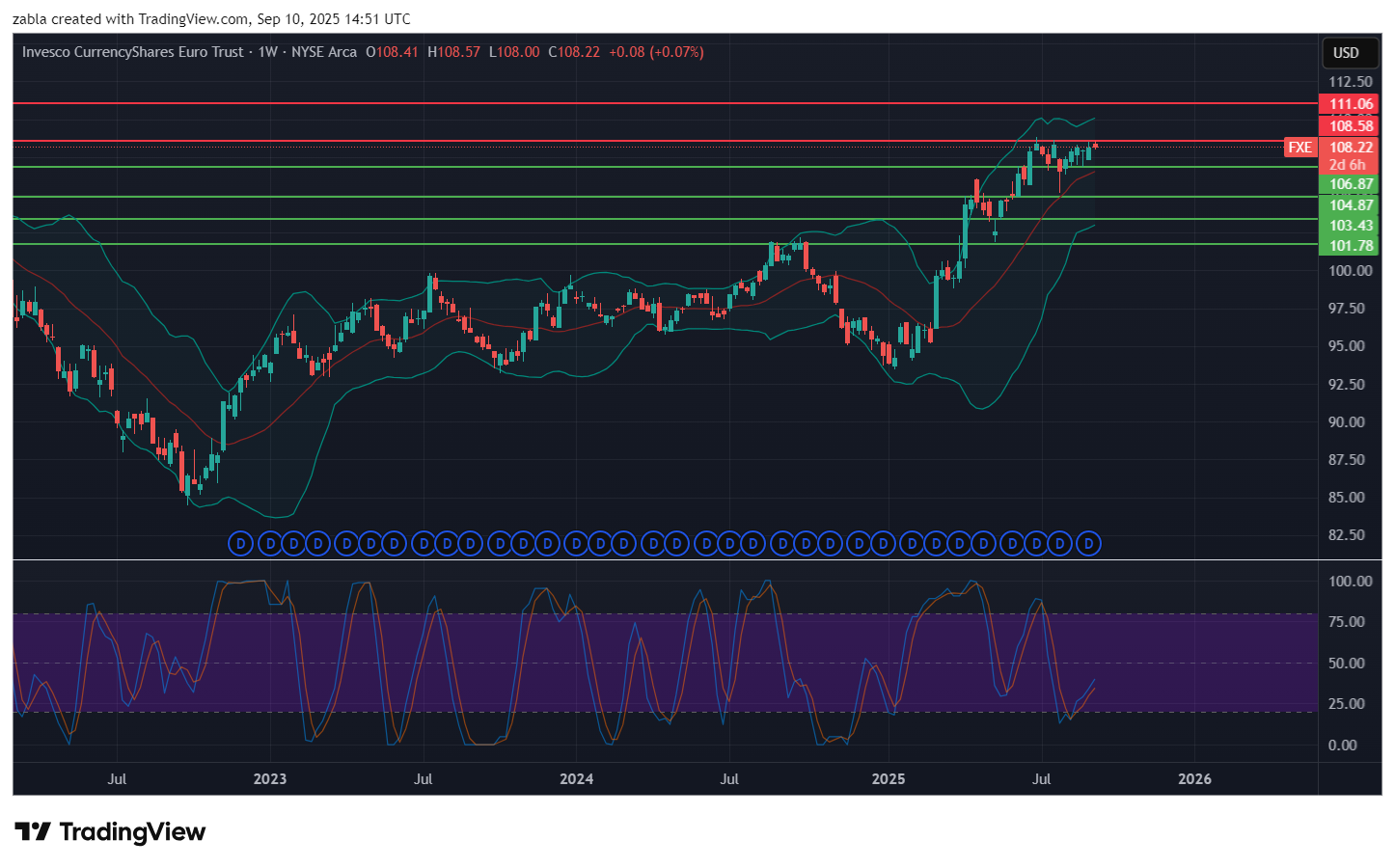 Az FXE pozitív kilátásokkal rendelkezik, röviden a Fed várható kamatemelésének és az euró strukturális erősödésének. A következő két hónapban a 105-109 dolláros sávban várható kereskedés, felfelé mutat torzítással. A heti FXE grafikon remekül mutatja a technikai képet. Mely olyat mesél, hogy a mostani piros vízszintes ellenállás igen fontos lesz a jövőre nézve. Most már csak aza kérdés, hogy milyen geopolitikai események történek, illetve hogyan fog dönteni a FED! forrás: több pénzügyi oldal