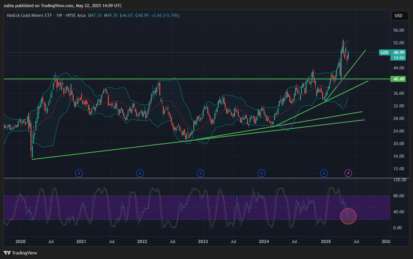 A Moody’s hitelminősítő intézet egyes bányászati cégek leminősítését ugyan bejelentette, de ez egyes elemzők szerint hosszabb távon kedvező lehet a magas osztalékhozamú részvények számára. Egy szó mint száz, ha emelkedik az arany, akkor itt is mutatkozik a történet. A heti grafikon is remekül mutatja, hogy van ráció a GDX ETF alapban. Főleg úgy, hogy a RSI indikátor még csak most fordul igazán vételi jelzésben. forrás: perplexity.ai