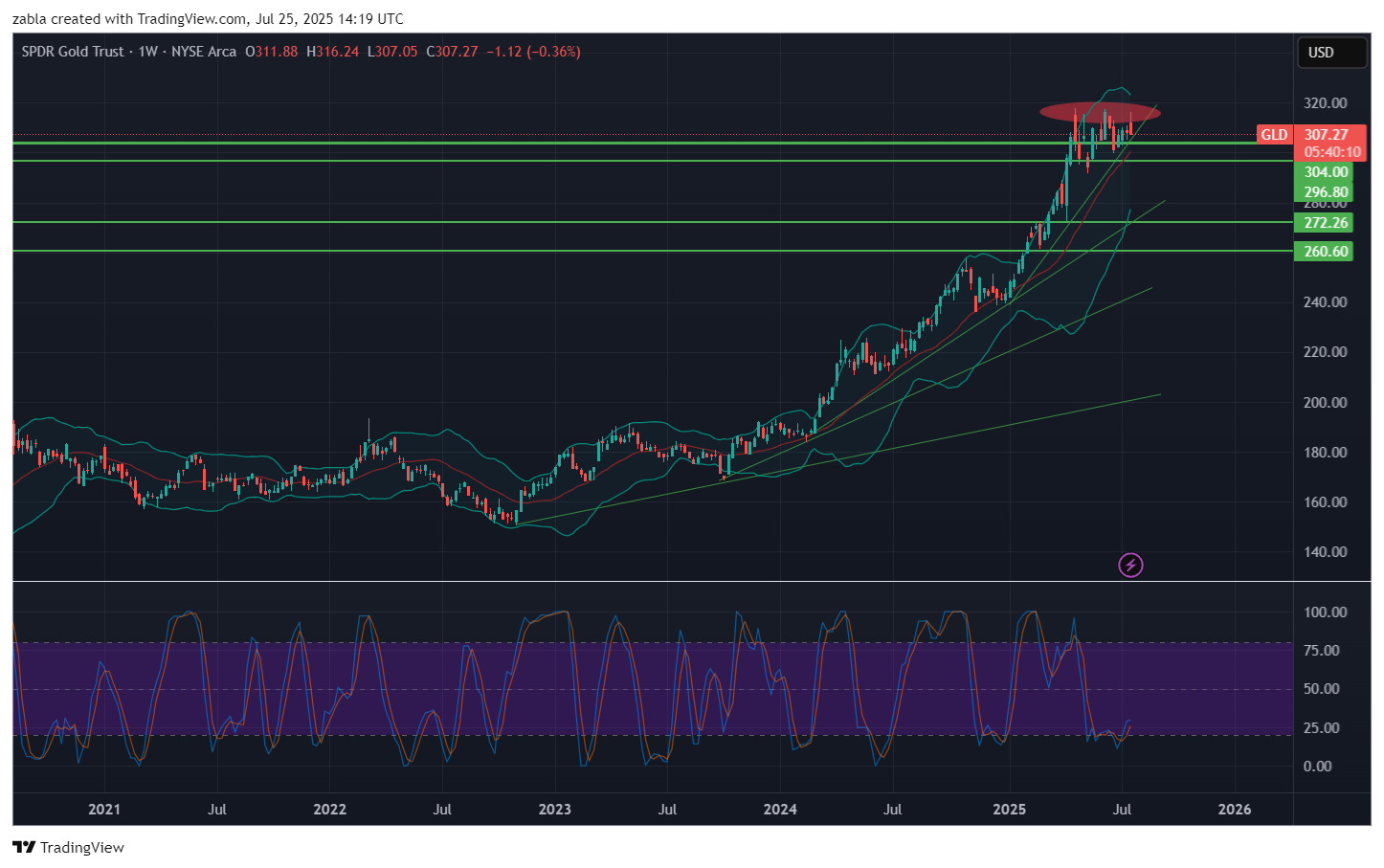 Az ETF-re (GLD) vonatkozó elemzések szerint két hónapos távon várható a 307–326 dolláros sávon belüli mozgás, enyhe pozitív kilátással.
