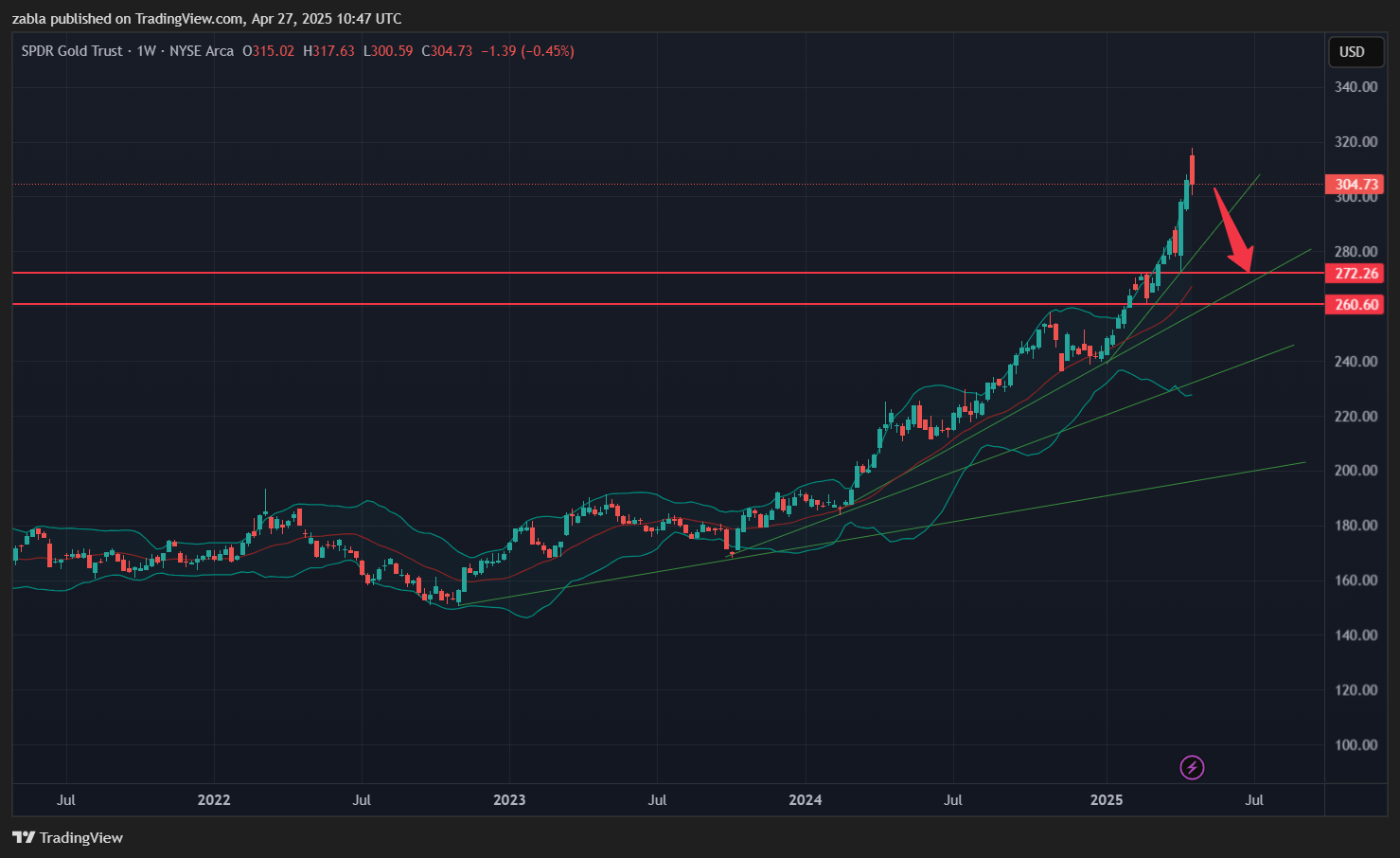 GLD-Gold némi korrekció várható. A GLD ETF alap, amely a fizikai arany árfolyamát követi, 2025 első hónapjaiban történelmi csúcsokat ért el, jelentős befektetői érdeklődés és geopolitikai bizonytalanság közepette. Az elkövetkező hónapokra a szakértői előrejelzések és a piaci hangulat alapján inkább oldalazó vagy mérsékelten korrekciós mozgás valószínűsíthető, de a hosszabb távú trend továbbra is pozitív maradhat. Piaci hangulat: A biztonsági menedékek (safe haven) iránti keresletet a globális gazdasági bizonytalanság, az amerikai–kínai vámháború és a recessziós félelmek táplálják. Túlvett piac: A GLD ETF relatív erősségi indexe (RSI) 77 felett van, ami túlvett állapotot jelez, ezért rövid távon korrekció vagy oldalazás várható. Makrogazdasági tényezők: A Fed kamatvágásai, a tartós inflációs félelmek és a geopolitikai feszültségek továbbra is támogathatják az aranyat, de a rövid távú profitrealizálás valószínű.