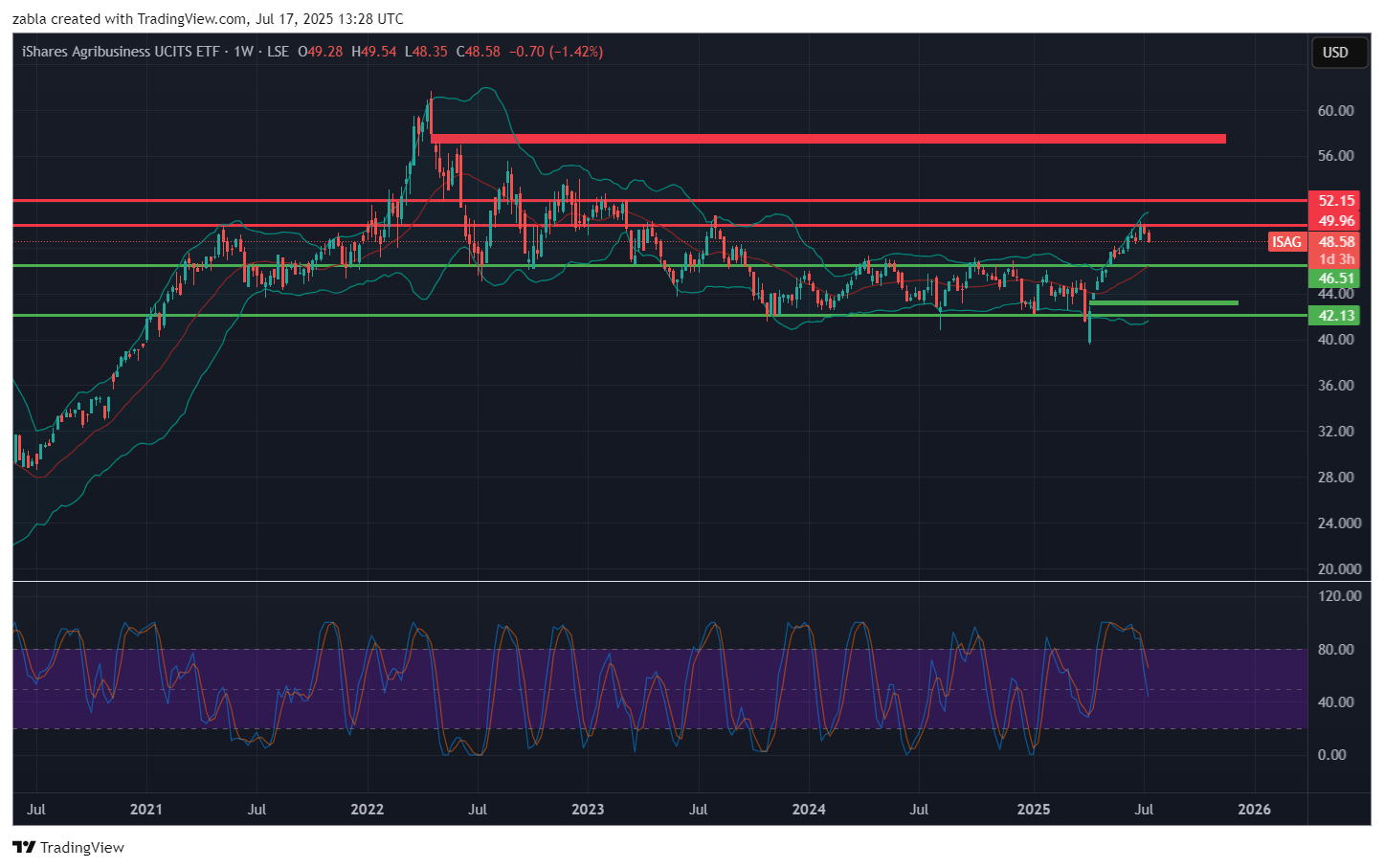 Globális mezőgazdasági ETF némi korrekciót mutat. Az ISAG ETF a mezőgazdasági vállalatokból álló, globális portfóliót követi, amely az S&P Commodity Producers Agribusiness index teljesítményét tükrözi. Az alap fizikai replikációval működik, azaz ténylegesen megvásárolja az indexben szereplő részvényeket.