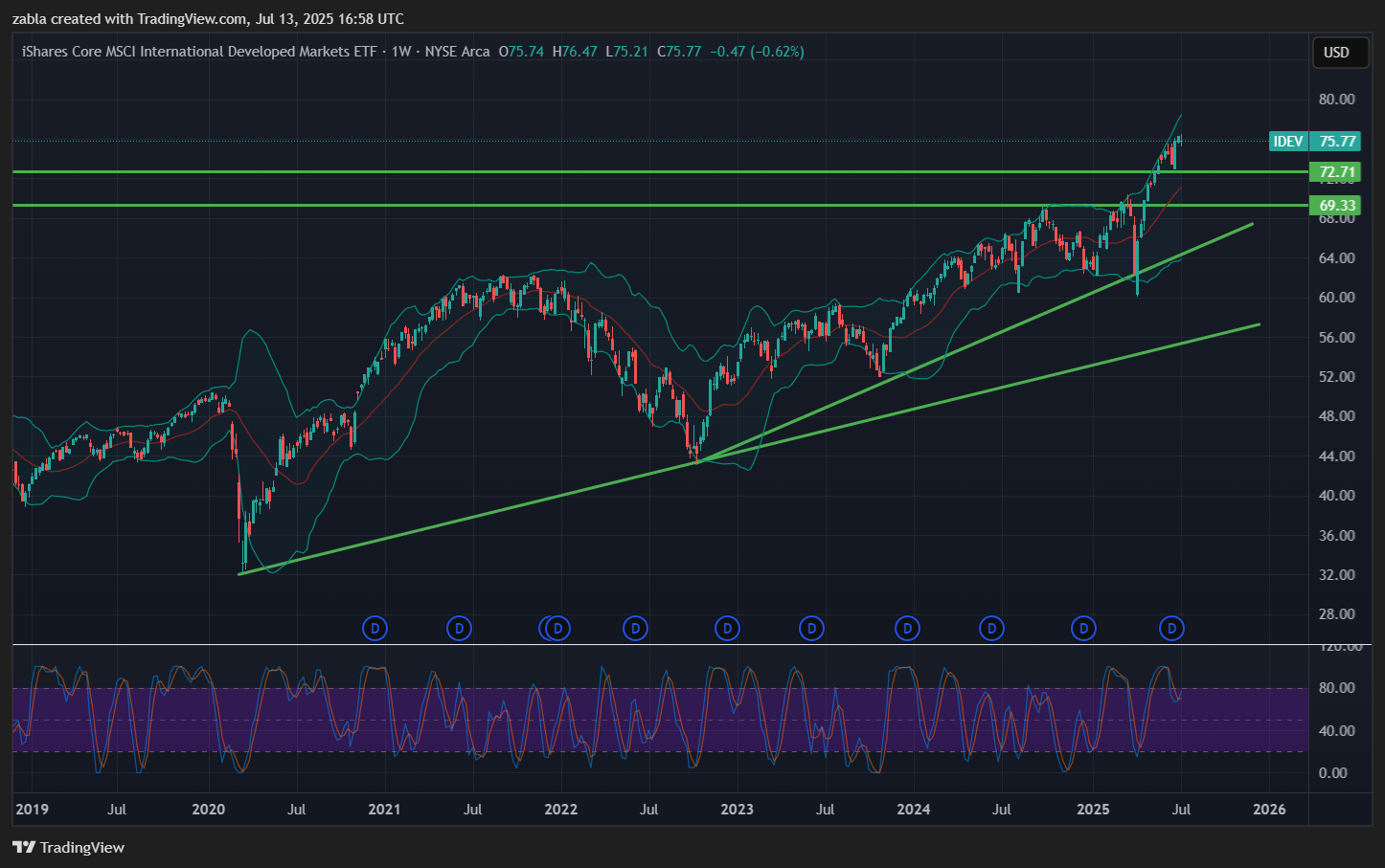 Az IDEV ETF rendszeresen fizet osztalékot, évente kétszer, általában júniusban és decemberben. A legutóbbi osztalékfizetés 2025. júniusában történt, értéke 1,28 USD volt részvényenként, az éves várható osztalékhozam jelenleg 2,8–3,4% között mozog. Az osztalék mértékét a portfólióban lévő vállalatok eredményessége és osztalékpolitikája határozza meg. A heti grafikon remekül mutatja, hogy igen stabil a fejlett piaci ETF alap amerikai részvények nélkül. forrás: több pénzügyi oldal