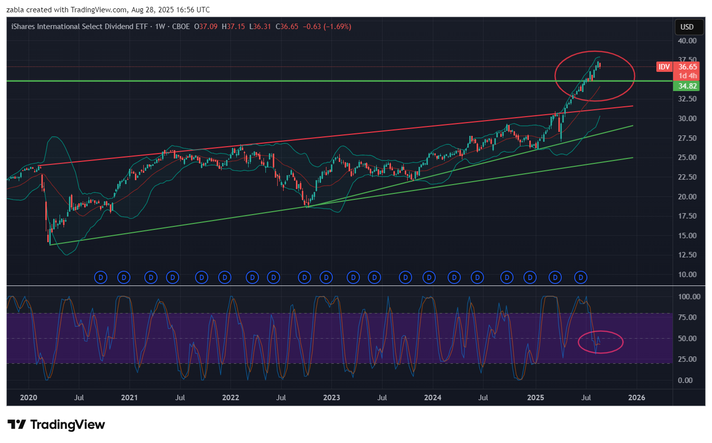 Az IDV ETF stabil választást kínál az osztalékra orientált befektetők számára, mérsékelt kockázattal és rendszeres jövedelemmel. Bár a következő 2 hónapban jelentős árfolyamemelkedés nem várható, a globális gazdasági stabilizáció és az alacsony kamatkörnyezet hosszú távon kedvezhet a teljesítményének. A heti IDV grafikon igen szépen meg lett véve, melyből korrekció indult el. Ami további csökkenést vetít előre, 35 $ környékén lehet egy meghatározó támasz! A többi a gazdasági és geopolitikai kockázatok befolyásolhatják! forrás: több pénzügyi oldal