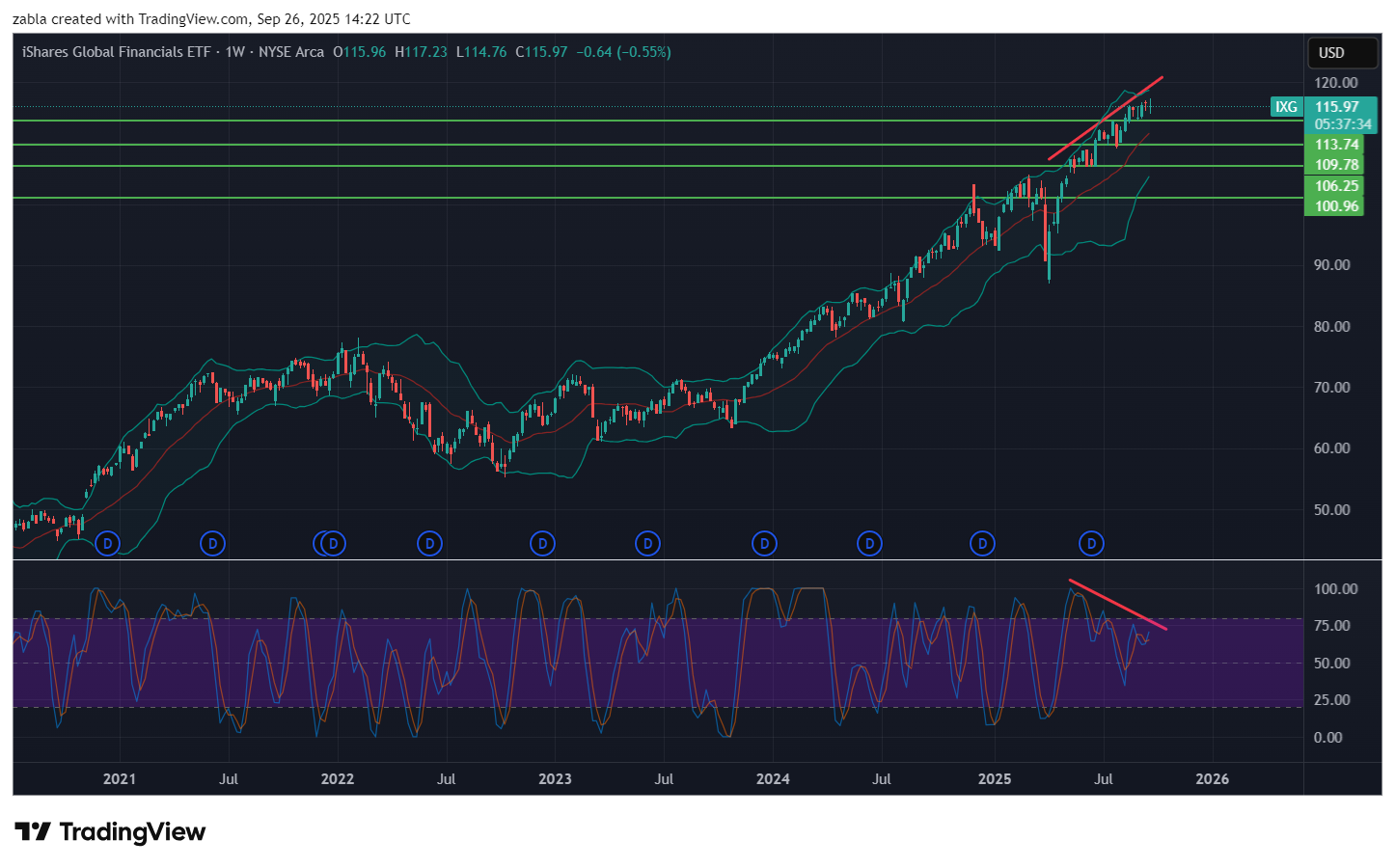 Összefoglalva, az IXG ETF árfolyamában októberben és novemberben egy kisebb visszaesés, korrekció várható, amely technikailag eladási jelekkel társul, de komolyabb zuhanás nem látszik az elemzések alapján. Az RSI indikátor és az árfolyam divergál, ami tovább erősíti a korrekció elindulását. 105 $ környékén is van egy GAP /rés/, ami aggasztó lehet, ha elindul a csökkenés, de ez igen mélyen van. Forrás: több pénzügyi oldal