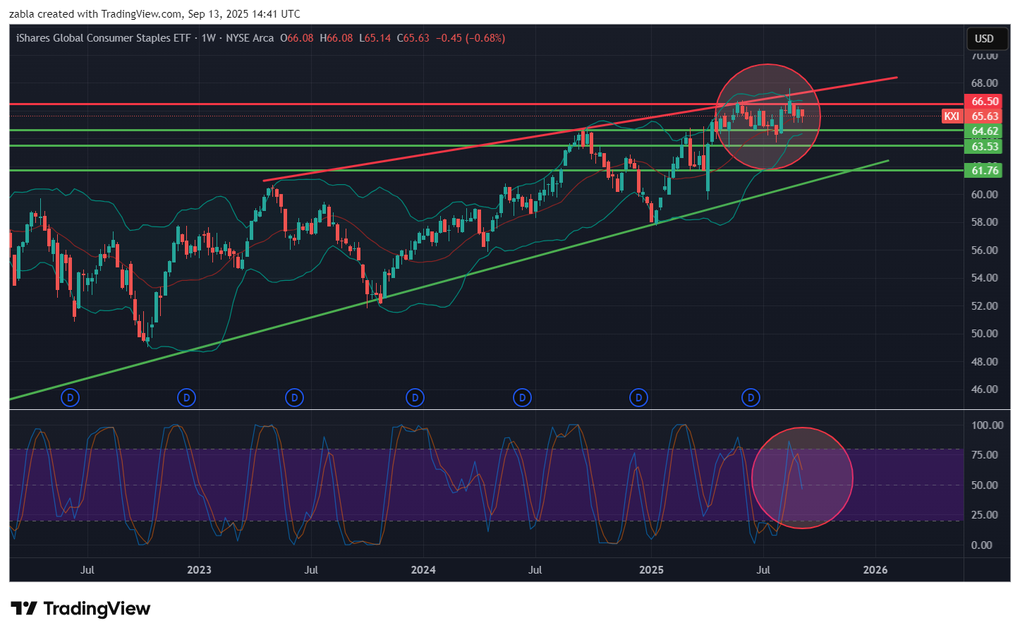 A következő két hónapra vonatkozó előrejelzések szerint a KXI árfolyama $65,17-$66,61 között mozoghat októberben és novemberben. A hosszú távú kilátások mérsékelt pozitívak, 2,75%-os éves potenciális hozammal. A szektor “normalizálódási” folyamata 2025-ben folytatódik, amit a stabil gazdasági környezet és a Fed kamatcsökkentései gondolatai, és a kamat csökkentése támogathatnak. A befektetők számára a KXI vonzó lehet védelmi eszközként, különösen az esetleges gazdasági lassulás esetén. A mérten pozitív technikai kilátások és osztalékfizetés kombinációja a hosszú távú értékteremtési potenciált kínál, bár rövid távon volatilitásra számíthatunk a vámok és inflációs nyomás miatt. Egyenlőre a heti grafikon igen szépen és erősen lefele kacsingat. A 64 $ környéki támasz segíthet abban, hogy a további emelkedés kialakuljon. Forrás: több pénzügyi oldal