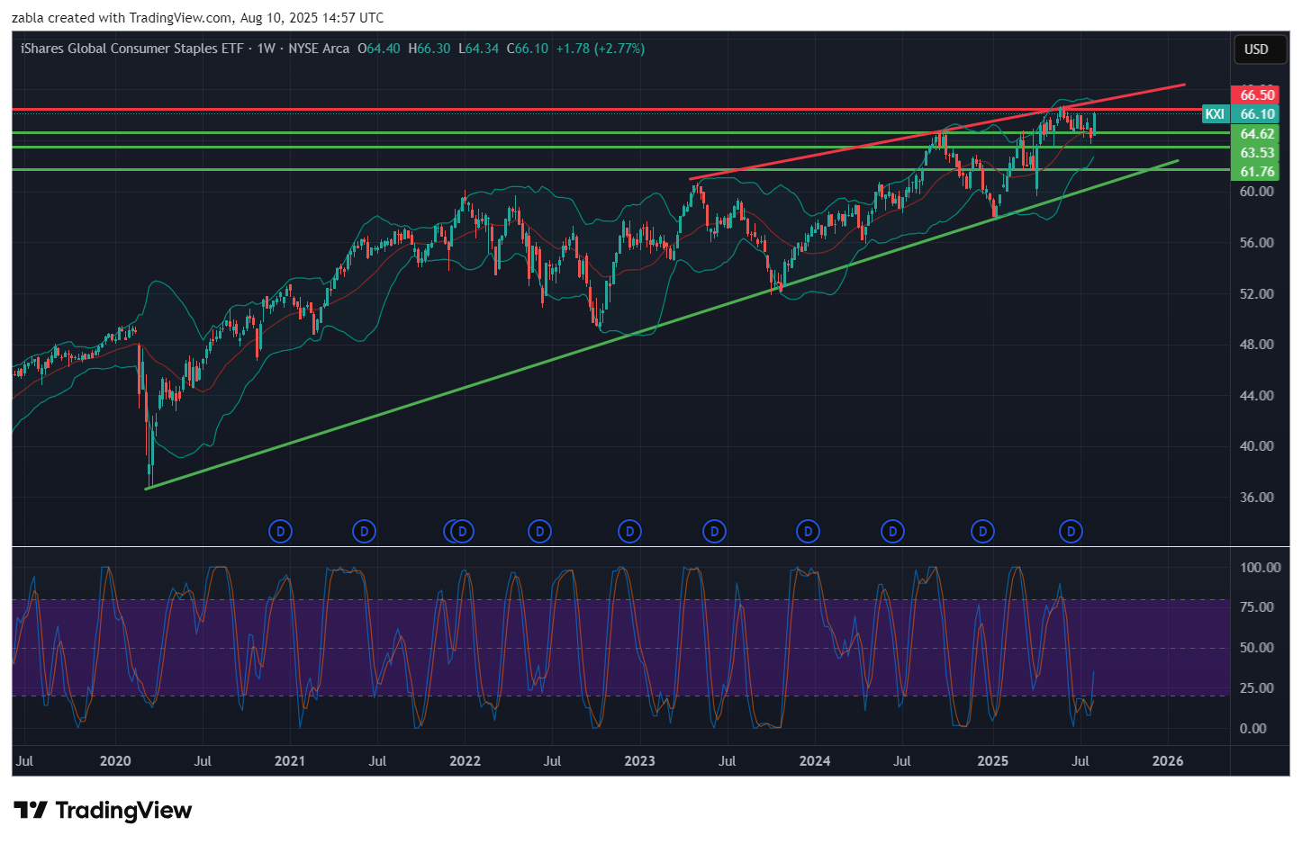 KXI Alapvető Fogyásztási ETF kitörés felé emelkedik. A KXI a globális fogyasztási cikkek (consumer staples) szektort követi az S&P Global 1200 Consumer Staples Capped indexen keresztül. Defenzív, nagyobb béta jellegű szektorkitettség (alacsonyabb volatilitás és konjunktúra-érzékenység), ezért jellemzően kisebb beszállási és mérsékeltebb emelkedési pálya azaz stabilabb árfolyamok.