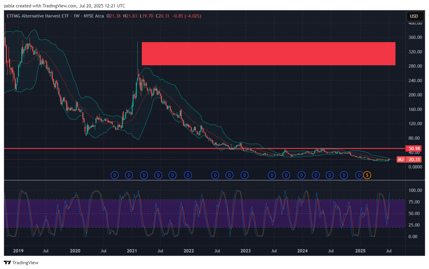MJ ETF kockázatos befektetés ciklikussága szektorpolitikai rizikók. Az MJ-ETFMG Alternative Harvest ETF egy cannabis- és kapcsolódó iparágakba (pl. dohány, növényvédő szerek) fektető alap. Az alap 2025 július közepén 20,31 USD körül, ingadozó árfolyamon kereskedhető.
