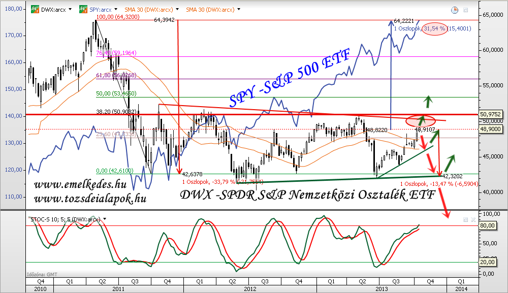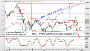 Amit a nagyobb indexek is, mint példa gyanánt az SPY ETF alapon is érezhető lesz. Akkor lehetnek bajban a piacok először, ha a ferde zöld támaszt letöri, és erőteljesen közelit a 42,5 $-os meghatározó támasz felé, ami cirka 13%-os mélységben van. Összességében ez csak egy indikátornak nevezhető összehasonlítás, azonban érdemes figyelni a DWX -S&P Nemzetközi Osztalék ETF alap mozgására, itt bővebben és valós idejű grafikonnal. mert ha elindul lefelé, akkor közel hasonló esést tapasztalhatunk mint anno 2011 második felében. Ez nagyon jó beszállási lehetőséget vetít elénk, mivel annyira alulértékelté válik az ETF alap, hogy akár, sőt 10% fölé is mehet az osztalékhozam mértéke, és akkor az lesz az igazi Osztalékvarázs.