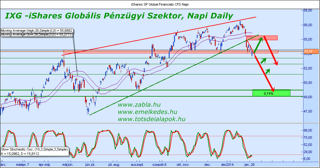 Pénzügyi törés, az IXG -iShares S&P Globális Pénzügyi szektor ETF alapban. A pénzügyi törés egy meghatározó árfolyamtartomány letörését jelenti. A jövőhét első napjaiban ki fog alakulni, hogy mennyi erő van a pénzügyi cégekben. Amennyiben nem lesz elég erő a visszatesztelésre, csupán csak a rés betöltésére, akkor teljes pénzügyi törés alakulhat ki, melyben közel 10%-os csökkenés is benne lehet.