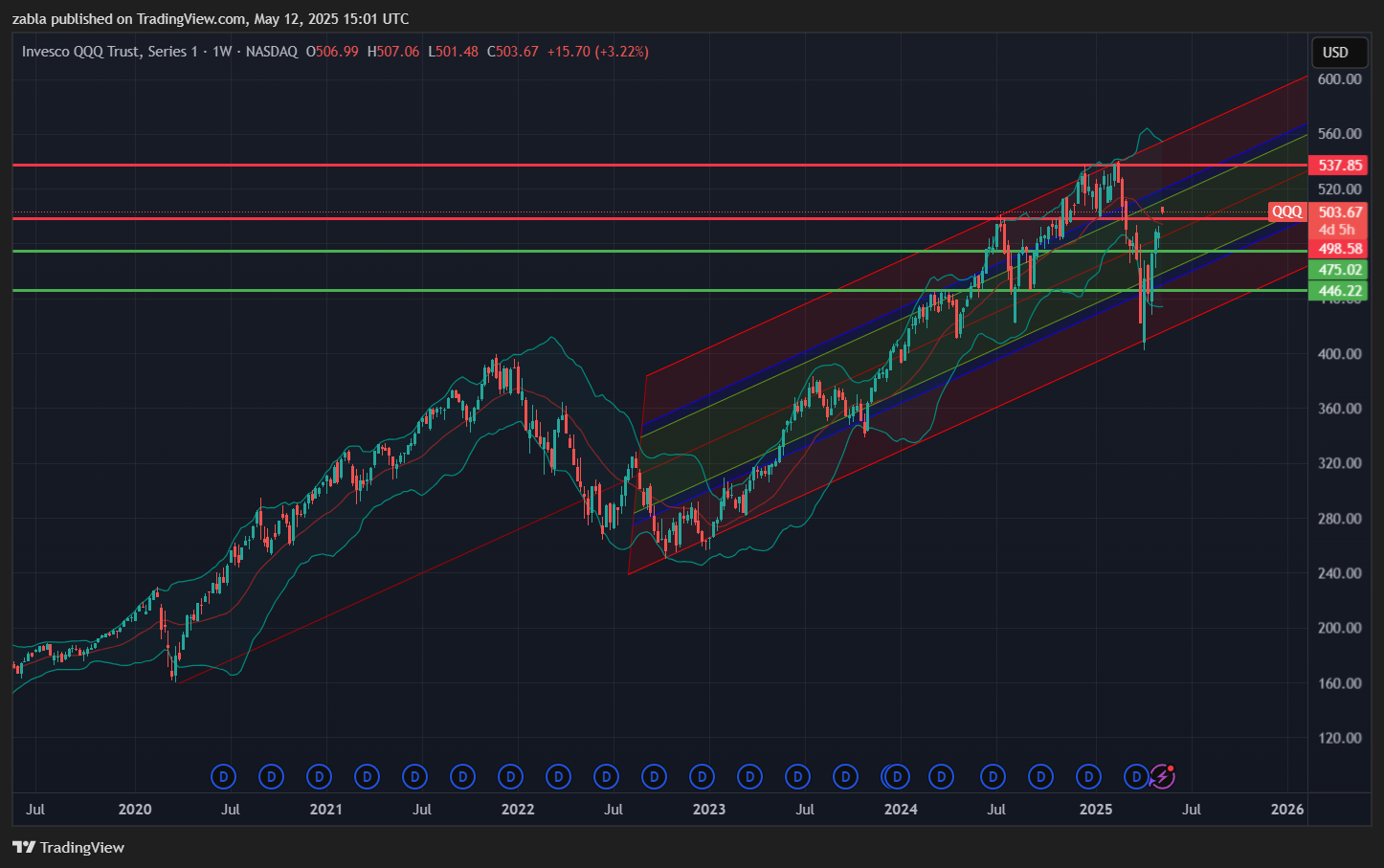 QQQ-NASDAQ 100 ETF meghatározó szinten. Az elemzői várakozások szerint 2025 nyarán is mérsékelt emelkedés várható a QQQ ETF árfolyamában. A május–júniusi időszakban az előrejelzések szerint 1–1,1% közötti havi növekedés valószínű, de a technológiai szektor túlsúlya miatt a volatilitás továbbra is jellemző lehet. Hosszabb távon a technológiai innovációk és a digitális megoldások iránti kereslet miatt pozitív a kilátás, de rövid távon bármilyen piaci vagy szabályozói hír átmeneti korrekciót okozhat. A heti grafikonon remekül láthatod, hogy az 500 $-os szint igen meghatározó a további árfolyam tekintetében.