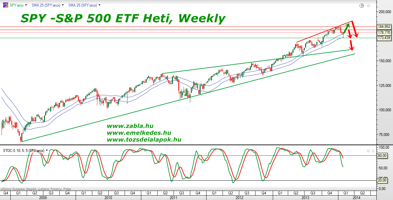 Így nagyon érdekes és izgalmas lehet a jövőheti kereskedés. Mivel azért annyira mélyen nincs a piac, hogy pár nap alatt le ne dolgozná az utóbbi napok mínuszait. Így célba véve a legutóbb maximumokat, és ez az SP 500 pénzhenger bátorságot ad a befektetőknek. Azonban kíváncsian várom a 181,5 és a 184, 95 $-os ellenállások környékén az SPY árfolyamának a viselkedését. Leginkább a 184,95 $-os árfolyamtartomány lehet érdekes, mivel ez a legutóbbi csúcs. Aminek az ellenállási vonalát szépen mutatja a ferde piros ellenállás. Ahhoz, hogy tényleges és megbízható emelkedés alakuljon ki fontos a 181,5 $-os ellenállás áttörése, mivel ez a letörési szint is egyben. Tehát ez a 1-2%-os emelkedés sok mindent eldönthet a jövőre nézve. Ha megáll az SP 500 pénzhenger körüli érzet, azaz elfogy a lendület, akkor jöhet a tényleges lefordulás és a mostani támasz tesztelése újra.