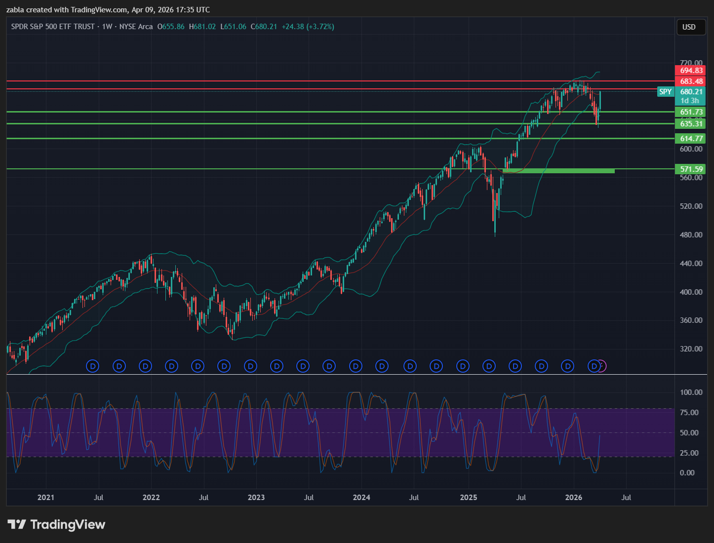 A SPY egy “várakozó állásponton” lévő, de ereje teljében lévő piacon van. A technikai kép alapján a $680-$700-as ellenállási zóna áttöréséhez kiváló banki jelentésekre és megnyugtató inflációs adatokra lesz szükség a napokban. Igen jól néz ki a SPY heti árfolyamának grafikonja, amit a grafikon is szépen mutat. Amit a heti RSI indikátor is alá tud támasztani, mert erőteljes vételi jelzéseket mutat. Forrás: több pénzügyi oldal.