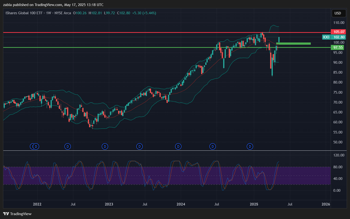 TOP 100 részvény rést hagyott maga alatt. Az iShares S&P Global 100 ETF (IOO) közelít a legutóbbi csúcsok felé, ami 105 $ környékére tehető. Ez egy igen fontos szint lehet az IOO ETF alapnak. A következő két hónapban a várható árfolyam-mozgás és a júliusi osztalékfizetés együttesen enyhén javíthatja a teljes hozamot.