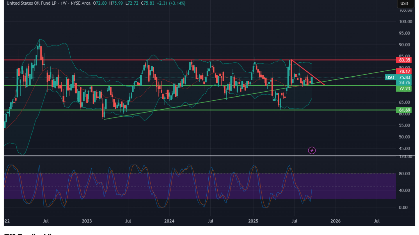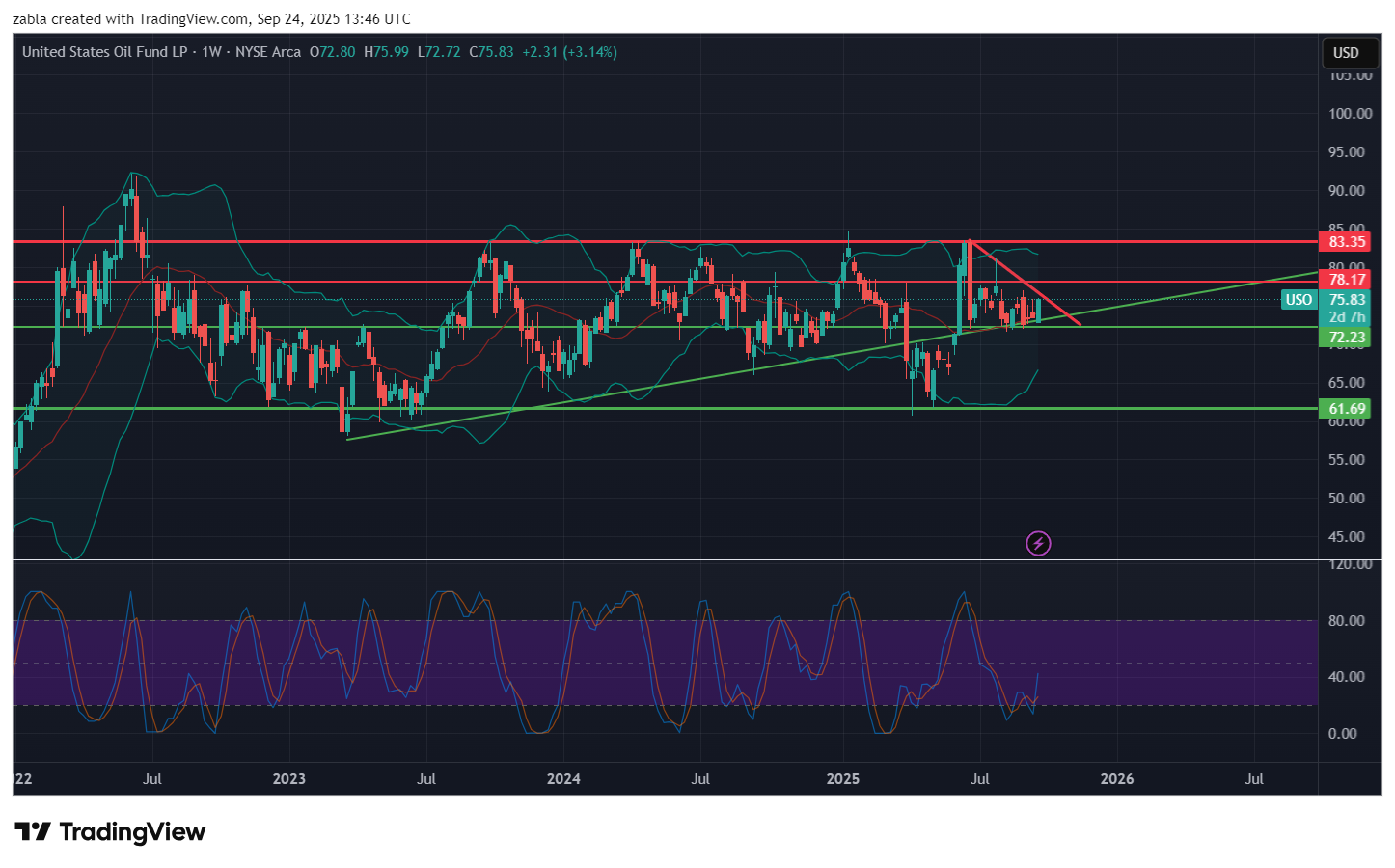 Az USO ETF októberi-novemberi kilátásai bearish /medve/ jellegűek a fundamentális túlkínálat miatt. A technikai szintek 72-85 dolláros sávban mozoghatnak, ahol a 72 dollár alatti szintek tesztelése kritikus. A geopolitikai prémium 5-15 dollár közötti kockázatot hordoz, de az alapvető kereslet-kínálat jobb árakat támogat. Befektetési szempontból óvatos megközelítés javasolt, a pozíciók méretezésénél figyelembe kell venni a magas volatilitást és egy kedvezőtlen fundamentális környezetet is. A heti USO grafikon erőteljes emelkedésben van a héten, amit az RSI indikátor is támogat. Amennyiben 80 $ fölé tud kerülni az árfolyam, akkor további emelkedés is kialakulhat technikai oldalról nézve. forrás: több pénzügyi oldal