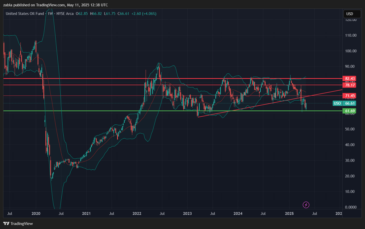 USO US WTI Olaj oldalazás várható. A május eleji árfolyammozgásokat tekintve az USO ETF árfolyama 69 USD körüli szintről indult, majd enyhe csökkenést mutatott, 65–66 USD körüli tartományban mozgott, néhány napon belül 2–3%-os napi elmozdulásokkal.