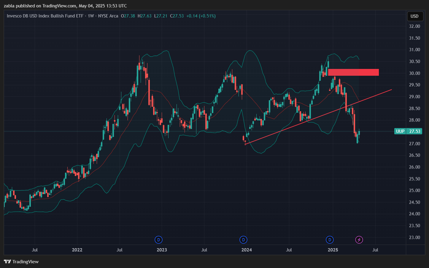 UUP Dollár Index erősödést mutat. Az UUP Invesco DB Index árfolyama, a következő két hónapban enyhén emelkedhet, de a volatilitás magas lehet a devizapiaci tényezők miatt. Az osztalékfizetés csak év végén várható /december/, és az index devizaösszetétele erőteljesen az euróra támaszkodik. A befektetőknek figyelembe kell venniük a devizaárfolyam-kockázatot és a makrogazdasági hatásokat is.