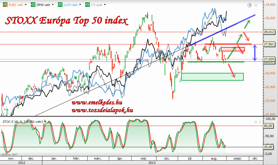 Stoxx Európa Top 50 indexét megtartotta a 27 €-os erős támasz, ami a jövőben lehet érdekes, mert ha ezt letöri az index dinamikus csökkenés következhet. Azonban egyenlőre vételek mutatkozhatnak az indexben. Érdekes lehet a 27,60 €-os ellenállás, mely alatt rés vár betöltésre, ezen szinteken sok múlhat a következő napokban.
