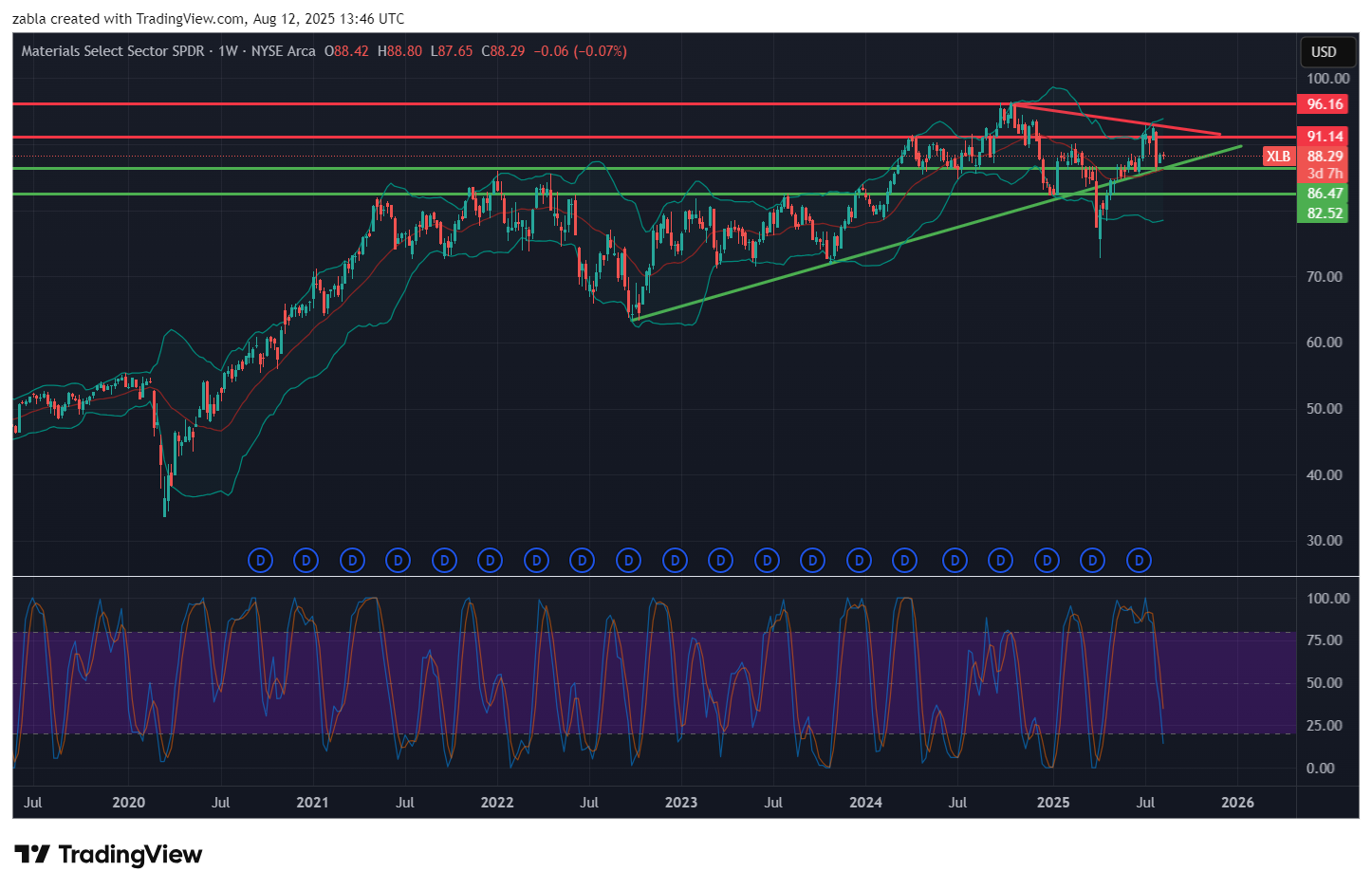 XLB kockázatként érdemes számolni kínai kereslet volatilitásával. A Materials Select Sector SPDR Fund (XLB) az S&P 500 alapanyagipari szektorát követi, olyan iparágakkal, mint a vegyipar, fém- és bányászat, csomagolóipar, papír-erdőgazdálkodás és építőanyagok. Az XLB jellemzően negyedévente fizet osztalékot; 2025-ben a legutóbbi 0,44$ volt (ex-nap: 2025-06-23), és a közelgő szeptemberi 0,42-0,44 $ körül várható, a futó hozam ~1,8-2,0% sávban mozog.