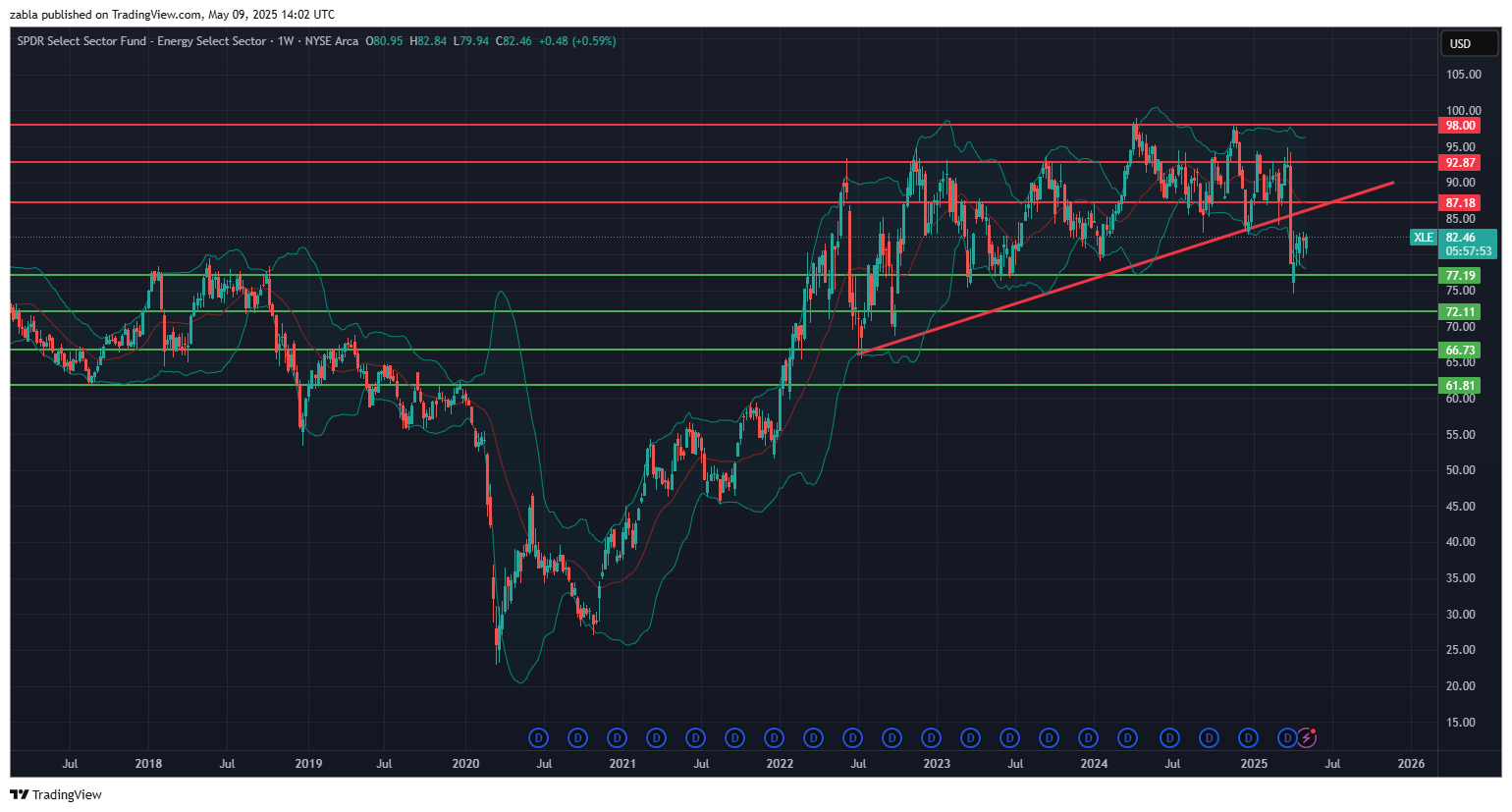 XLE USA Energia szektor rövid távon sérülékeny. Az XLE ETF május elején 80–82 USD közötti sávban mozog, az elmúlt 30 napban a legalacsonyabb ár 74,49 USD, a legmagasabb 83,21 USD volt. A 90 napos tartomány 74,49–94,82 USD, az éves csúcs pedig 97,92 USD.