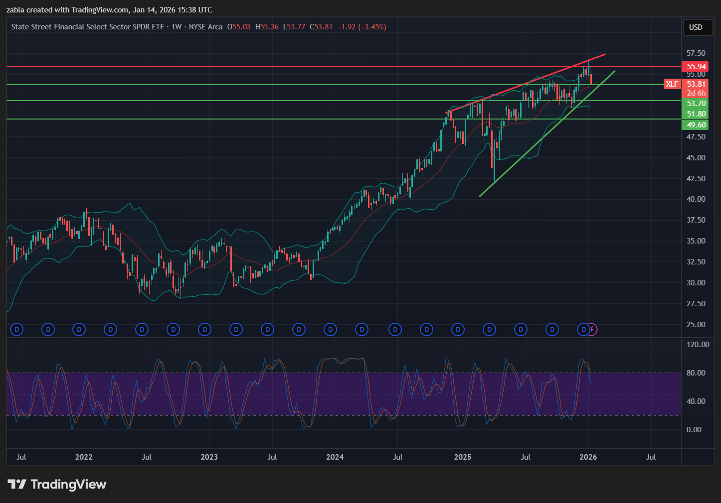 Amennyiben a jelentések pozitív meglepetést okoznak, az XLF visszatérhet az 56 dollár feletti tartományba, megerősítve a bika-trend folytatódását. Összességében a technikai kép jelenleg várakozó állásponton van, ahol a fundamentális hírek fogják kijelölni az irányt a következő hónapokra. Amit a heti grafikon is remekül mutat, érdekes lehet az elkövetkező időszakokra. forrás: több pénzügyi oldal