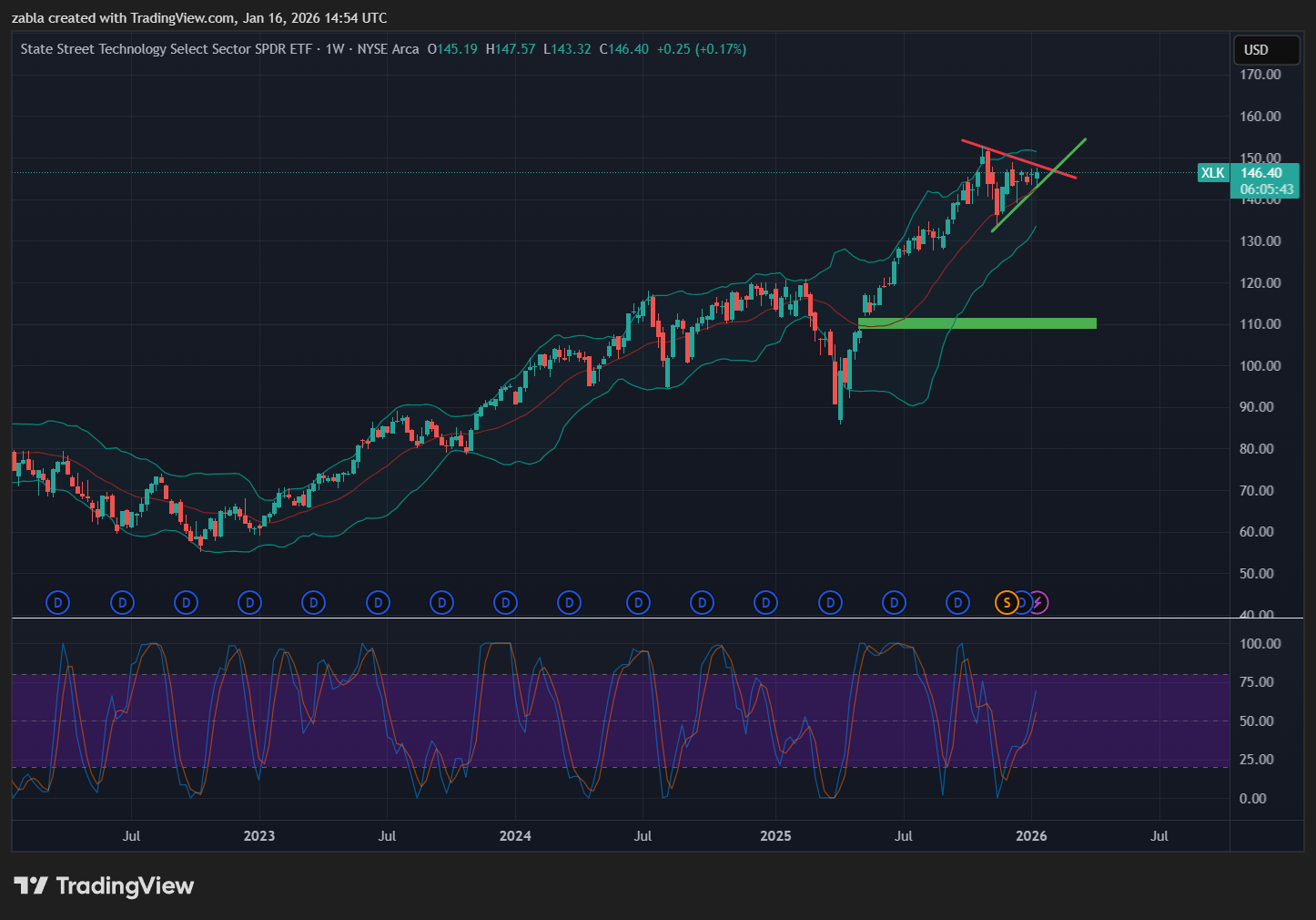 Technikai szempontból az alap árfolyama heti szinten 145 dollár környékén stabilizálódott, megőrizve a 2025 vége óta tartó emelkedő csatornát. A 10 és 50 napos mozgóátlagok januári pozitív kereszteződése, valamint a MACD indikátor vételi szignálja továbbra is optimizmusra ad okot a befektetőknek. Ugyanakkor a Stochastic oszcillátor rövid távú túlvásároltságot jelez, ami az ellenállási szintek közelében kisebb korrekciókat vagy oldalazást vetíthet előre a következő hetekben.