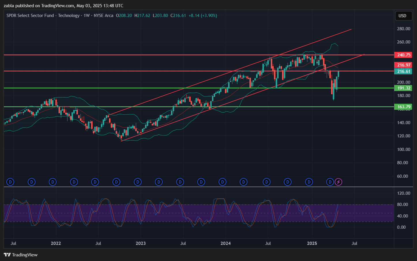 XLK USA Technológia emelkedési lehetőségben. Az XLK árfolyama 2025. április végén áttörte az 50 napos mozgóátlagot, ami technikai szempontból egy pozitív fordulatot jelez. A múltbeli hasonló esetek alapján nagy esély van arra, hogy az árfolyam tovább emelkedik a következő hónapban. A momentum indikátor és a MACD, valamint az RSI is pozitív jelet adott áprilisban, ami szintén erősíti a felfelé irányuló trend valószínűségét. A hosszabb távú (egyéves) előrejelzés szerint az XLK árfolyama akár 11–12%-kal is emelkedhet a következő évben.