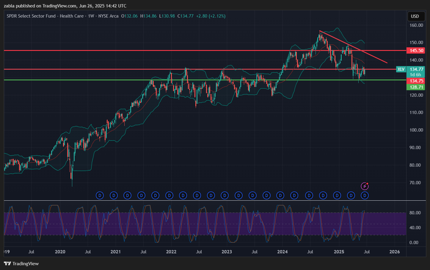 XLV csökkenő trendben némi emelkedési lehetőségek. Az XLV – Health Care Select Sector SPDR ETF az amerikai egészségügyi szektor vezető vállalataiba fektet, portfóliójában olyan cégek dominálnak, mint az Eli Lilly, Johnson & Johnson és UnitedHealth Group.