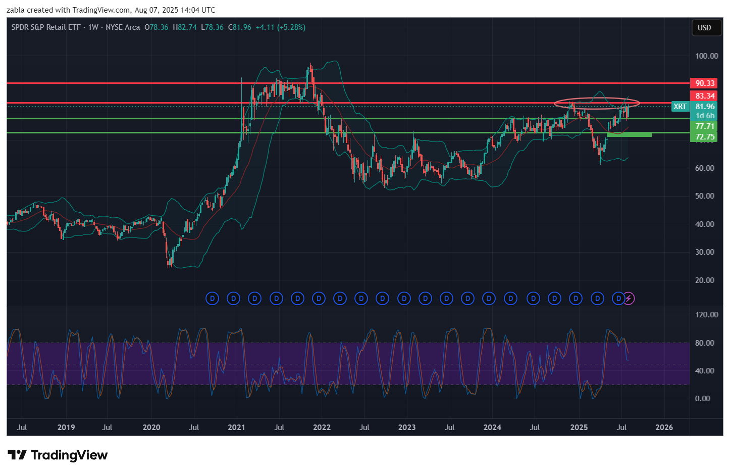 XRT USA kiskereskedelmi ETF fontos szinten. Az XRT-SPDR S&P Retail ETF árfolyama jelenleg 80-82 USD körül mozog, 52 hetes sávban 61.33–84.84 USD között ingadozott az elmúlt évben.